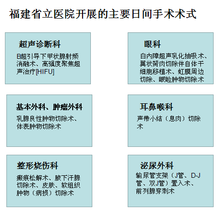 医院将进一步扩大日间手术病种,根据《中国日间手术合作联盟首批推荐56个日间手术目录》结合医院专科实际,扩大日间手术病种及手术科室,提升日间手术级别,目前我院已新增9个日间手术术式,包括妇科宫腔镜检查、宫颈椎切术、清宫术、耳鼻喉科颌面部浅表肿物切除术,声带息肉(小结)切除术、泌尿外科的腹腔镜下精索静脉高位结扎术、睾丸鞘膜翻转术、输尿管镜狄激光碎石术等。鼓励科室在保障医疗安全的前提下,开展日间手术。