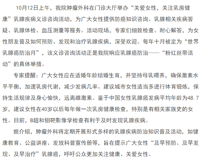 公益义诊:传递粉红丝带 关注乳房健康 行动趁现在——肿瘤外科举办乳腺疾病义诊咨询活动