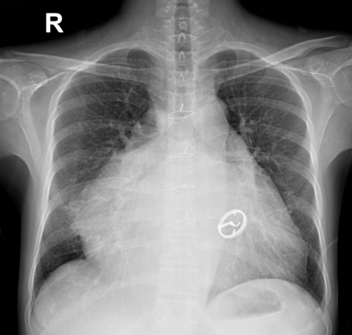 X光胸片提示巨大的心脏,大小超过正常心脏大小的2.5倍