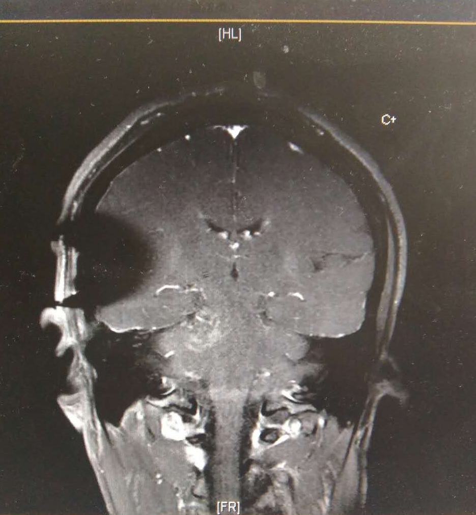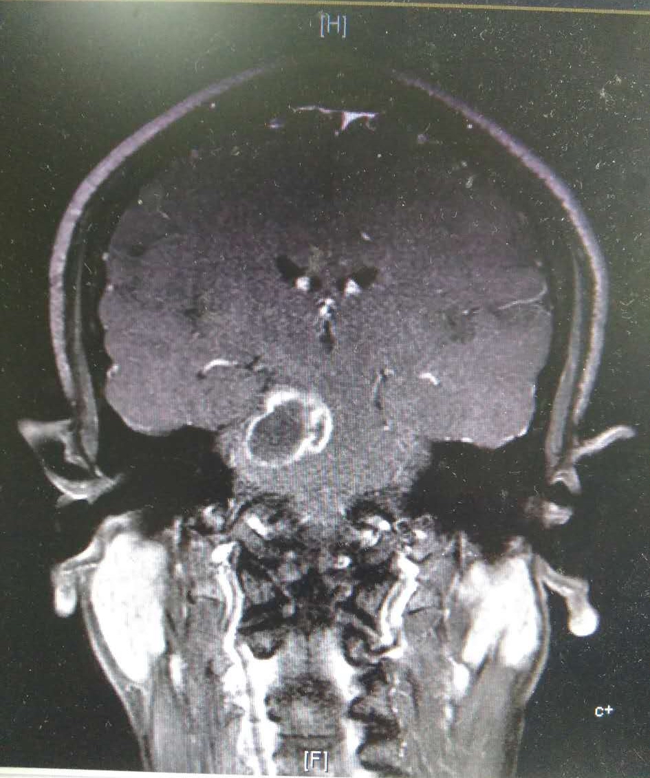 患者老陈入院时左侧肢体麻木20余天,并伴有头痛。检查发现是右侧中脑、脑桥部巨大占位性病变,累及桥臂,考虑为胶质瘤,属于危重的脑干肿瘤。经过充分的术前准备和沟通,神经外科主任黄绳跃主任医师带领团队黄继仁主任医师、陶剑副主任医师、辛惠宁副主任医师及洪礼传博士等,采取耳前约125px的微创切口,打开约1元硬币大小的骨窗,通过显微器械的辅助,在中枢最重要的神经纤维上精细操作,挑战生命禁区,历时3个多小时顺利完成手术。术后,患者在重症医学三科王开宇主任医师等医护人员的精心呵护下,仅2个多小时即神志清醒,拔除气管插管,第二天顺利转回神经外科普通病房,逐步自主进食,下床活动,第3天即基本恢复健康。术后7天拆线,完全康复出院。该病例标志我院神经外科医护团队在极其危重的脑干肿瘤手术上取得了长足进步,达到国内先进水平。
