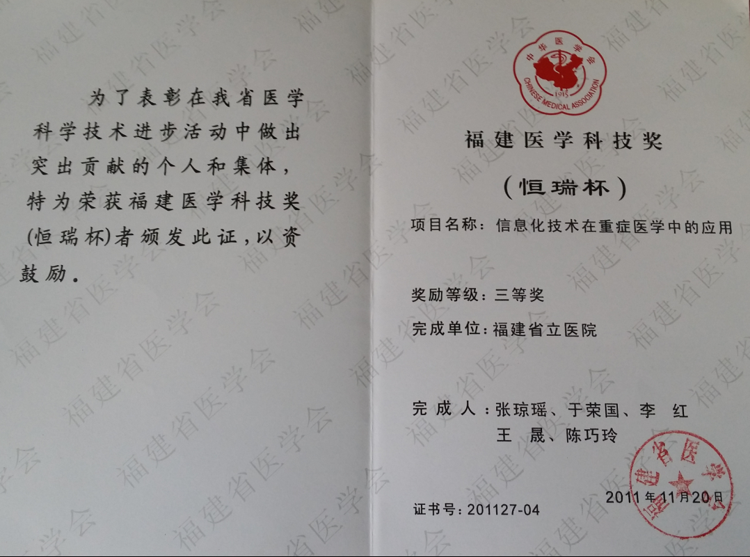 1.“信息化技术在重症医学中的应用”项目获得福建医学科技奖三等奖;