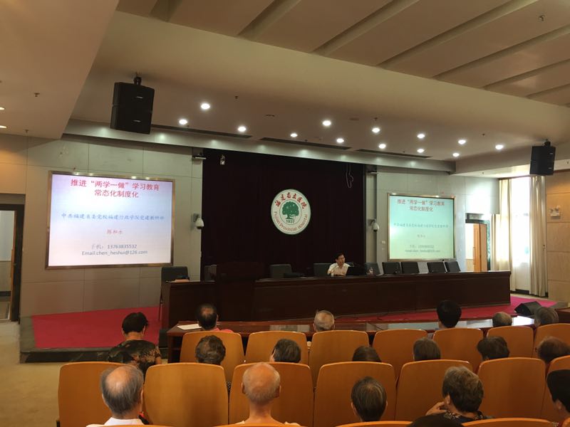 我院离退休党支部切实抓好“三会一课”制度,继续开好以“两学一做”为主题的党支部组织生活会。广大党员克服居住分散、年龄高行动不便等种种困难,每次都能坚持参加党支部组织生活会。为庆祝中国共产党成立96周年,在七一前夕(6月30日上午),离退休党支部邀请省委党校教授为离退休党员讲了一堂主题为“推进‘两学一做’学习教育的常态化制度化”的党课,地点设在医院学术会议厅,离退休党员100余人到会参加学习。陈教授主要从学习教育常态化制度化的意义、目标要求和具体措施三个方面内容进行讲述。通过这次党课,全体党员加深了对“两学一做”学习教育的常态化制度化重大意义和重要作用的理解和认识,他们将更加自觉地学好党章党规、学好习近平总书记系列重要讲话,努力做一名合格党员,为党和人民的事业增添正能量。在党课前,老干处陈英处长(离休支部书记)把今年省卫计委和医院的重要党建工作任务做了说明。并认真宣读了中共福建省卫生计生委党组关于印发的《认真学习贯彻习近平总书记重要指示深入开展向廖俊波同志学习活动的实施方案》,号召全体党员向先进学习,把学习先进与继续开展“两学一做”结合起来。
