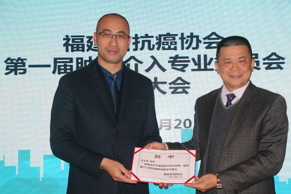 2017年12月20日,福建省抗癌协会第一届肿瘤介入专业委员会成立大会在福州举行。中国抗癌协会常务理事兼副秘书长、福建省抗癌协会理事长应敏刚教授,中国抗癌协会肿瘤介入学专业委员会主任委员、中国医师协会介入医师分会肿瘤介入专业委员会主任委员郭志教授到会指导。我院介入放射科副主任方主亭当选为副主任委员,陈良生主任受聘为顾问。