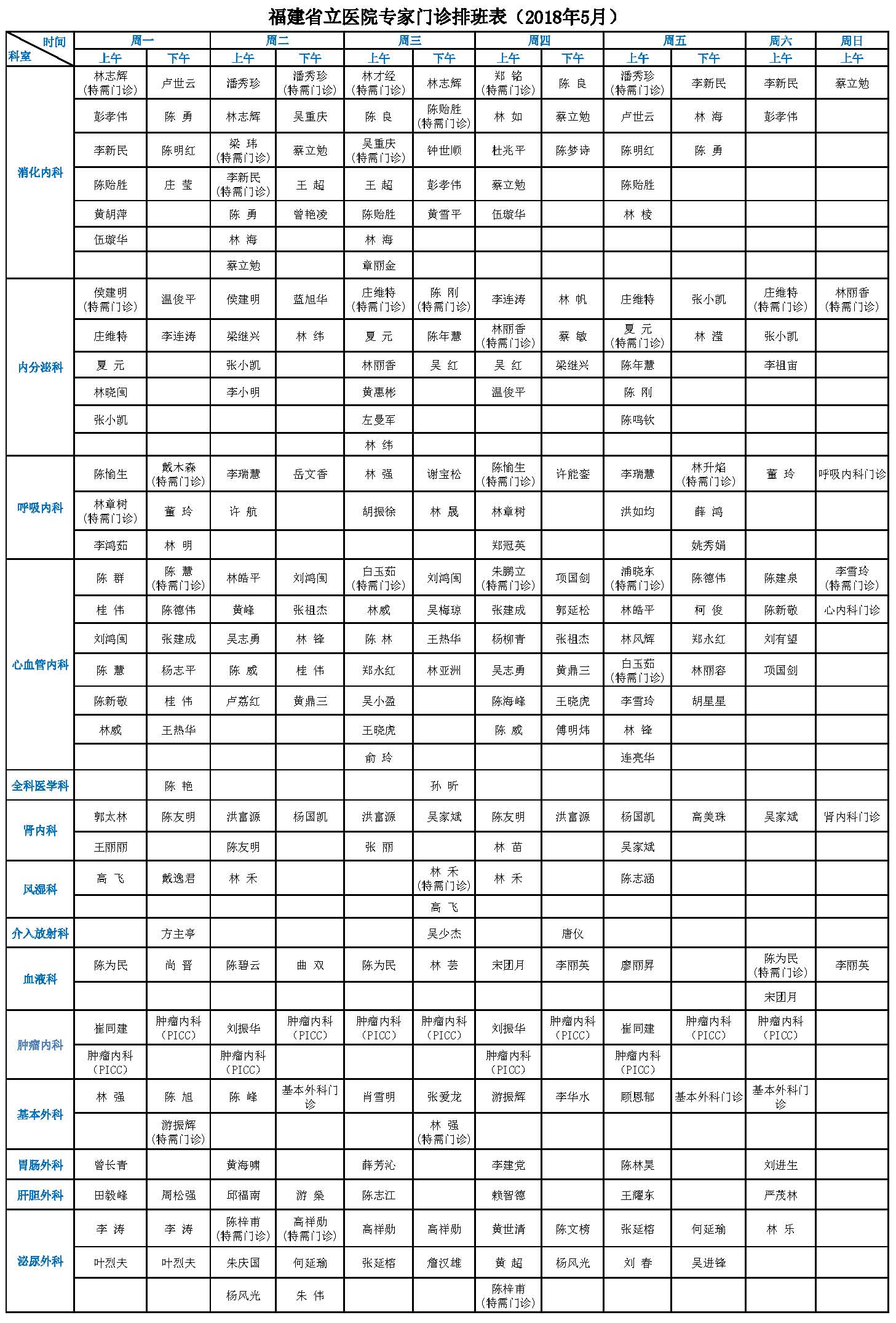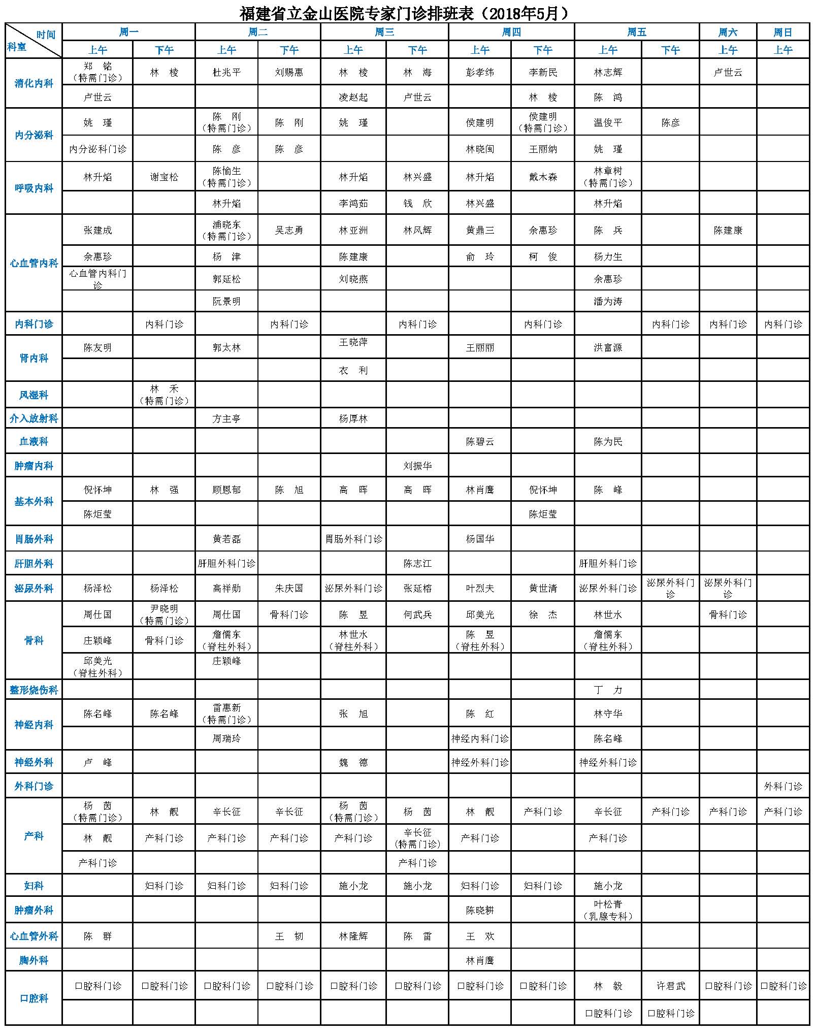 【收藏】福建省立医院、省立金山医院2018年五一节门诊安排、5月专家门诊一览表