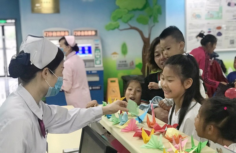 ▲门诊部的护士为小朋友们精心折叠千纸鹤,祈祷他们健康成长