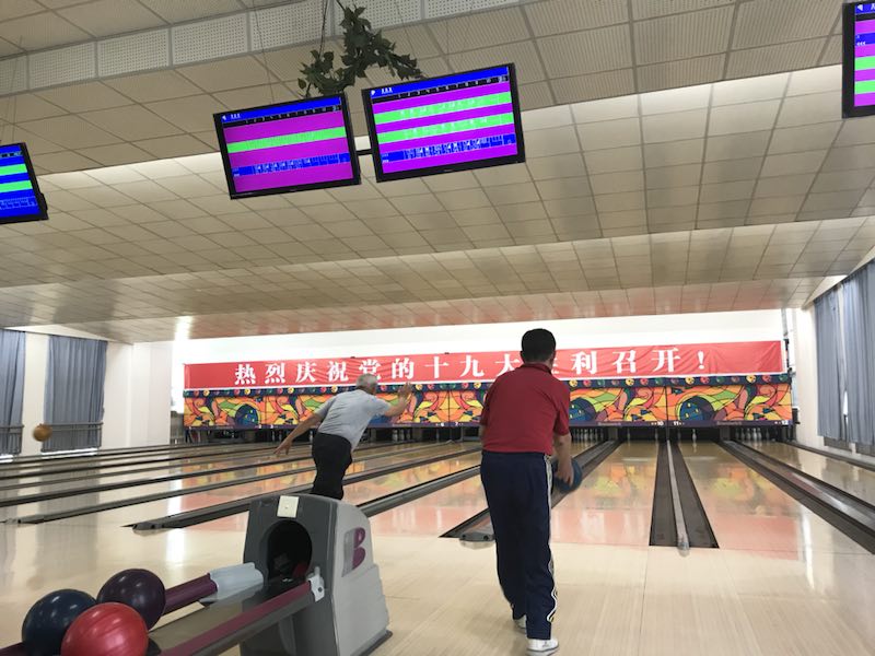 在清脆的球、瓶撞击声中,选手们相互交流,切磋技艺,击掌喝彩,保龄球馆内洋溢着紧张有序而又团结和谐的气氛。