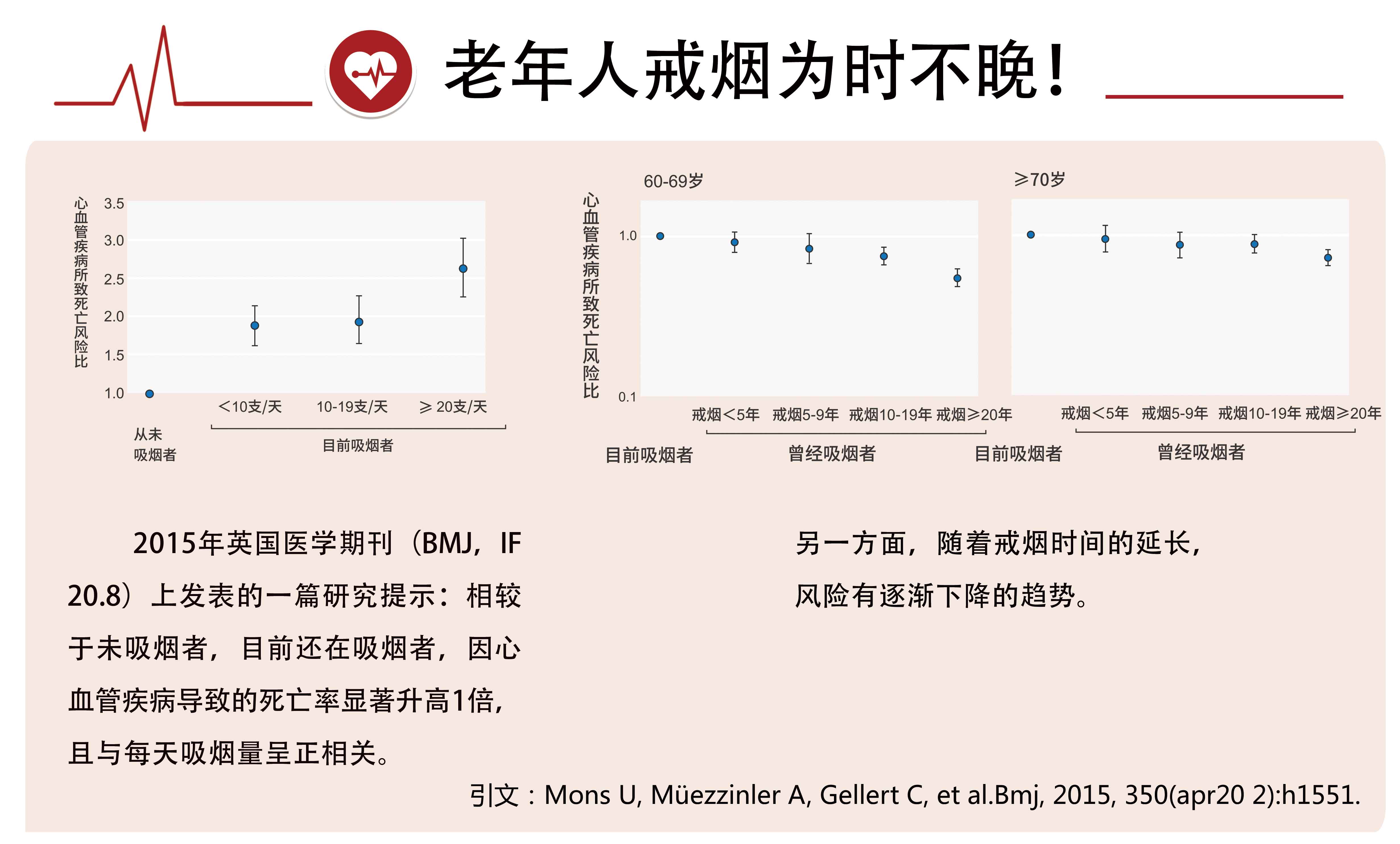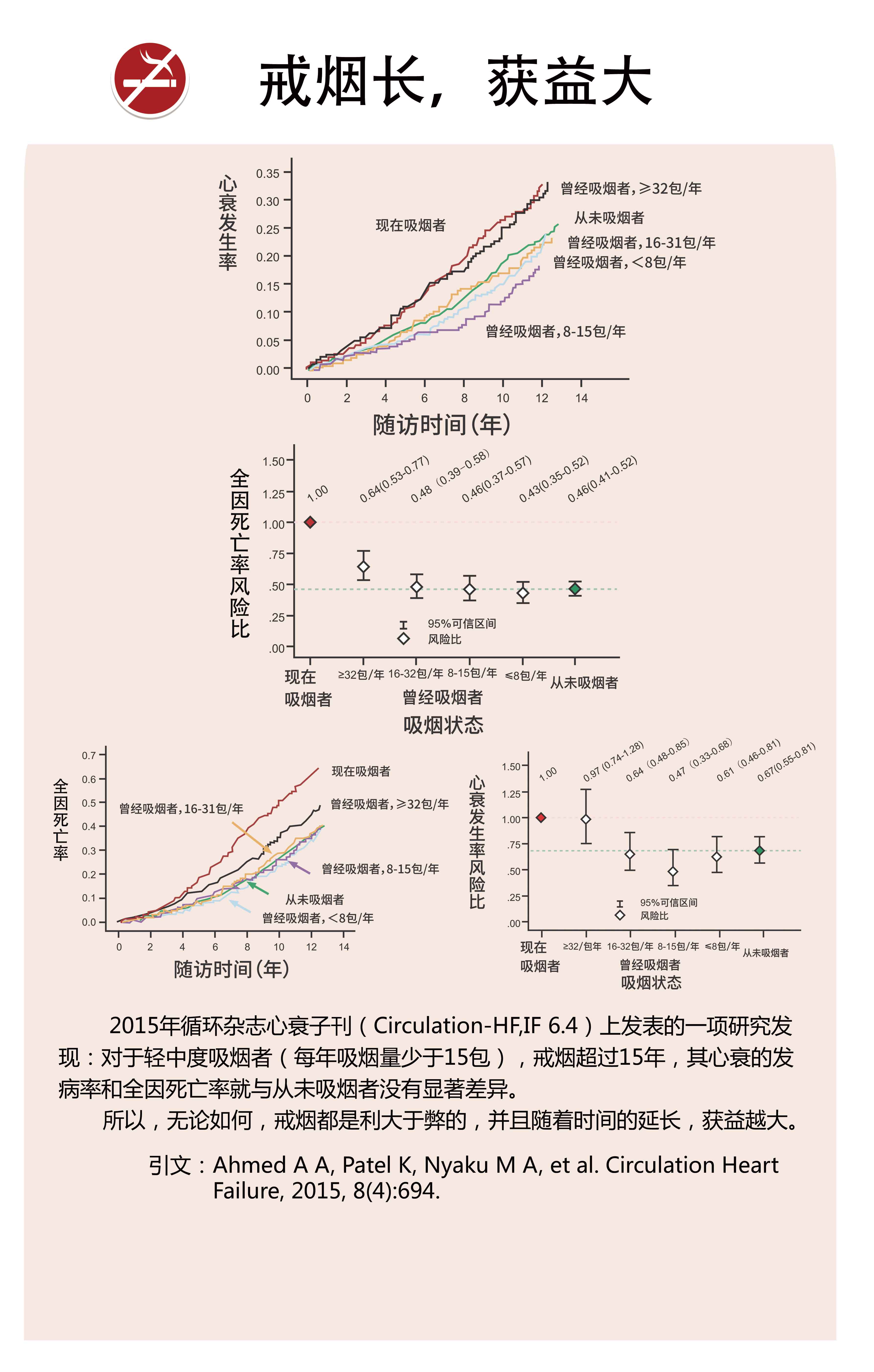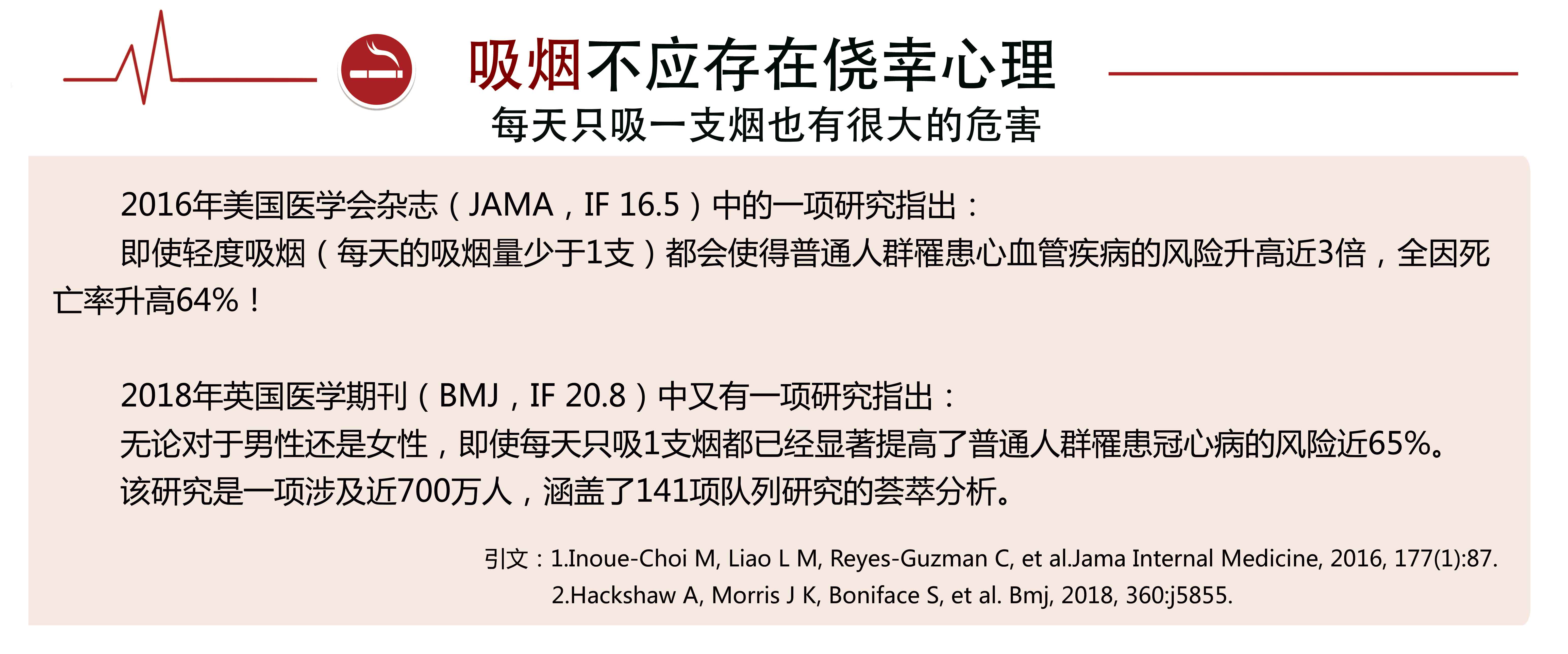 “每天只吸一支烟,也有很大危害。”他说,来自美国医学会杂志的一项研究显示,即使轻度吸烟(每天吸烟量少于1支),都会使得普通人群罹患心血管疾病的风险升高近3倍,全因死亡率升高64%。吸烟量越大,吸烟年限越长,冠心病和中风的发病及死亡风险越高。