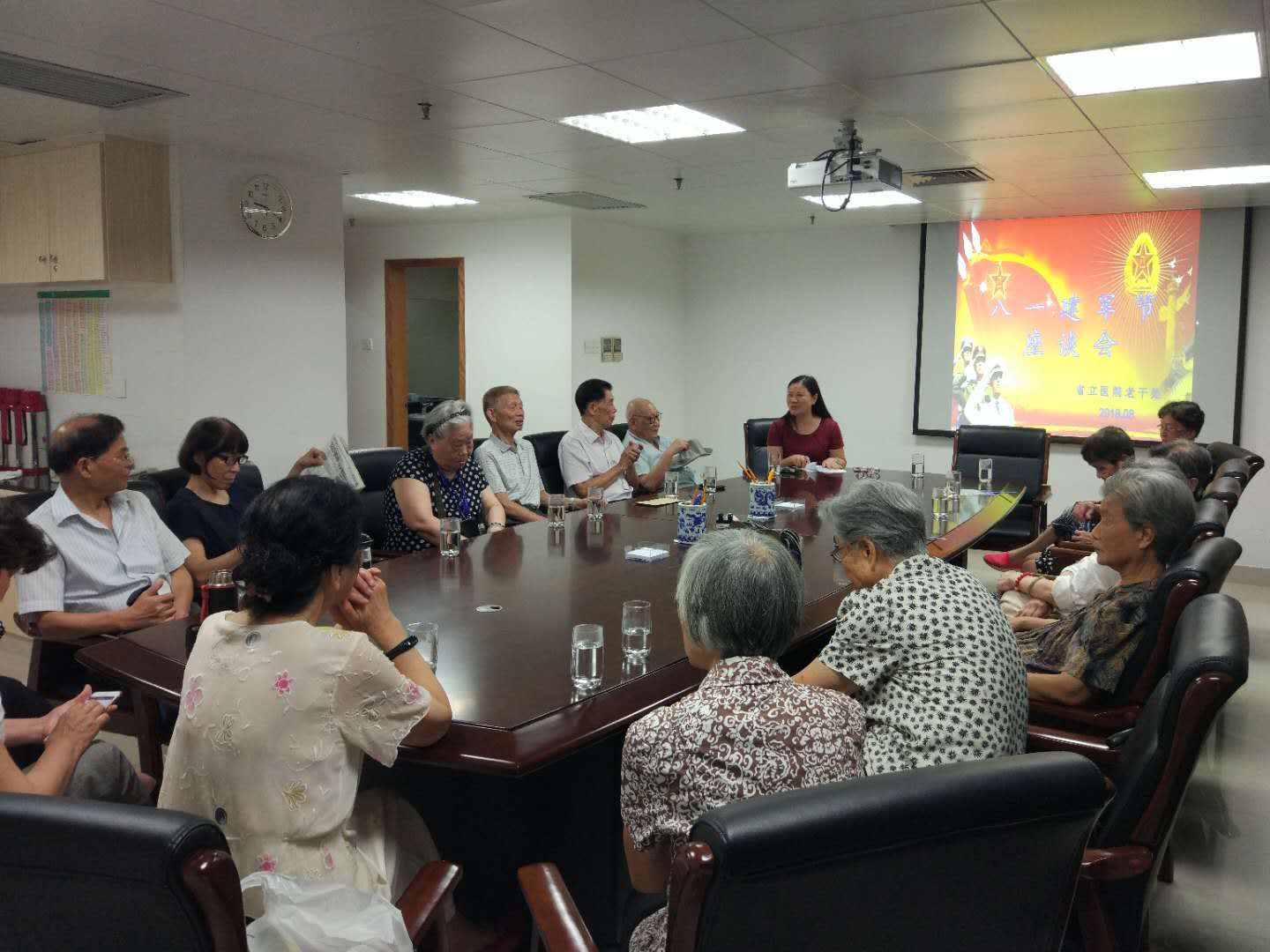八月一日,老干处组织20多位复转军人召开座谈会。会上老同志们回顾八一节的来历,谈军人生涯中难忘的经历。年龄最大的隋竹娥,当她谈起自己的军旅生涯时,感觉就像昨天发生的一样,实际是发生在1947年的事情,都已经过去了71周年。会上,老同志们畅谈自己的人生,并感谢医院领导的关心。座谈会在《我是一个兵》的歌声中结束,他们相约着明年的八一节再相聚。