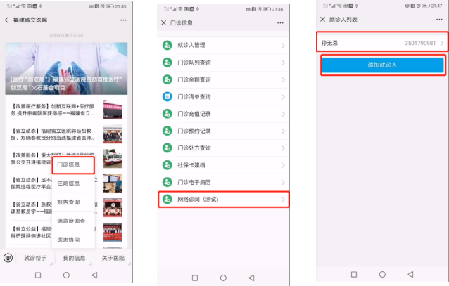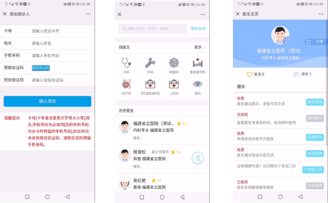 在就诊人列表需要绑定问诊人的消息,如第一次问诊需要添加就诊人,输入卡号、姓名、手机号对医院留存在医院信息对照,完成绑定。之后点击就诊人进入咨询复诊首页,根据需要寻找对应的医生,进入该医生主页,可选择图文咨询、电话咨询和在线续方。