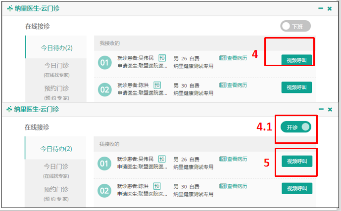 4.点击下班/开诊切换按钮,切换为开诊模式,如图4.1
