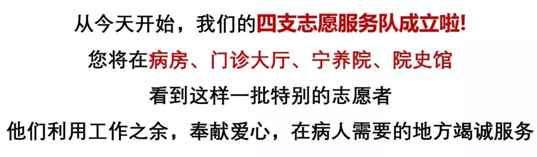 志愿服务是一项光荣的事业,是一次难得的人生经历,更是一次自我蜕变的机会。为传承雷锋精神、弘扬时代新风,坚持立足医院、服务社会,弘扬“奉献、友爱、互助、进步”的志愿精神,我们特别成立四支志愿服务队,希望更多职工、社会爱心人士加入,一起播撒爱心,传播社会正能量,培育社会新风尚。