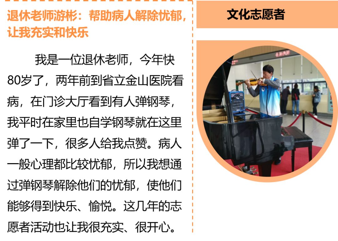 下午,志愿者们走入导诊服务台、门诊大厅、宁养院、院史馆等地方,集中开展门诊导诊、流程咨询、自助机使用、预约挂号、照护癌症患者、院史馆讲解、钢琴演奏等志愿服务活动,他们身着志愿者马甲,青春阳光,活跃在医院的各个角落,成为省立医院一道亮丽的风景线。