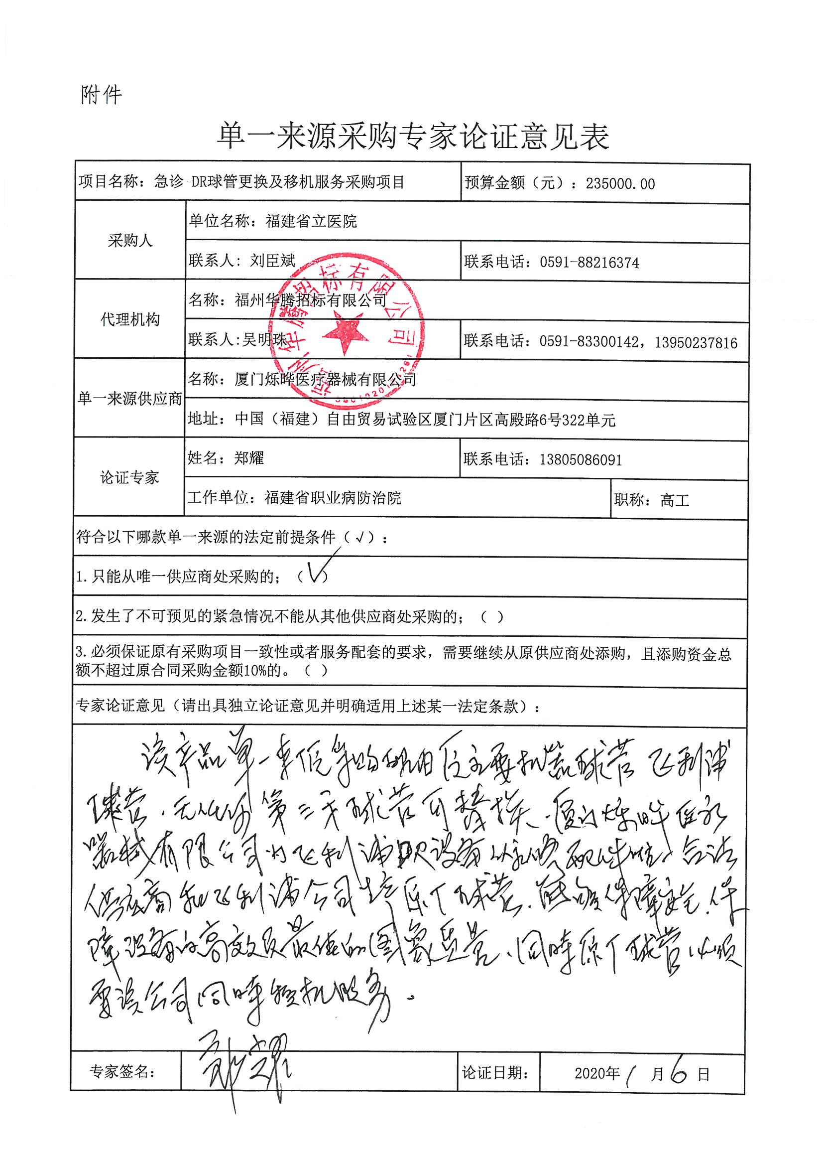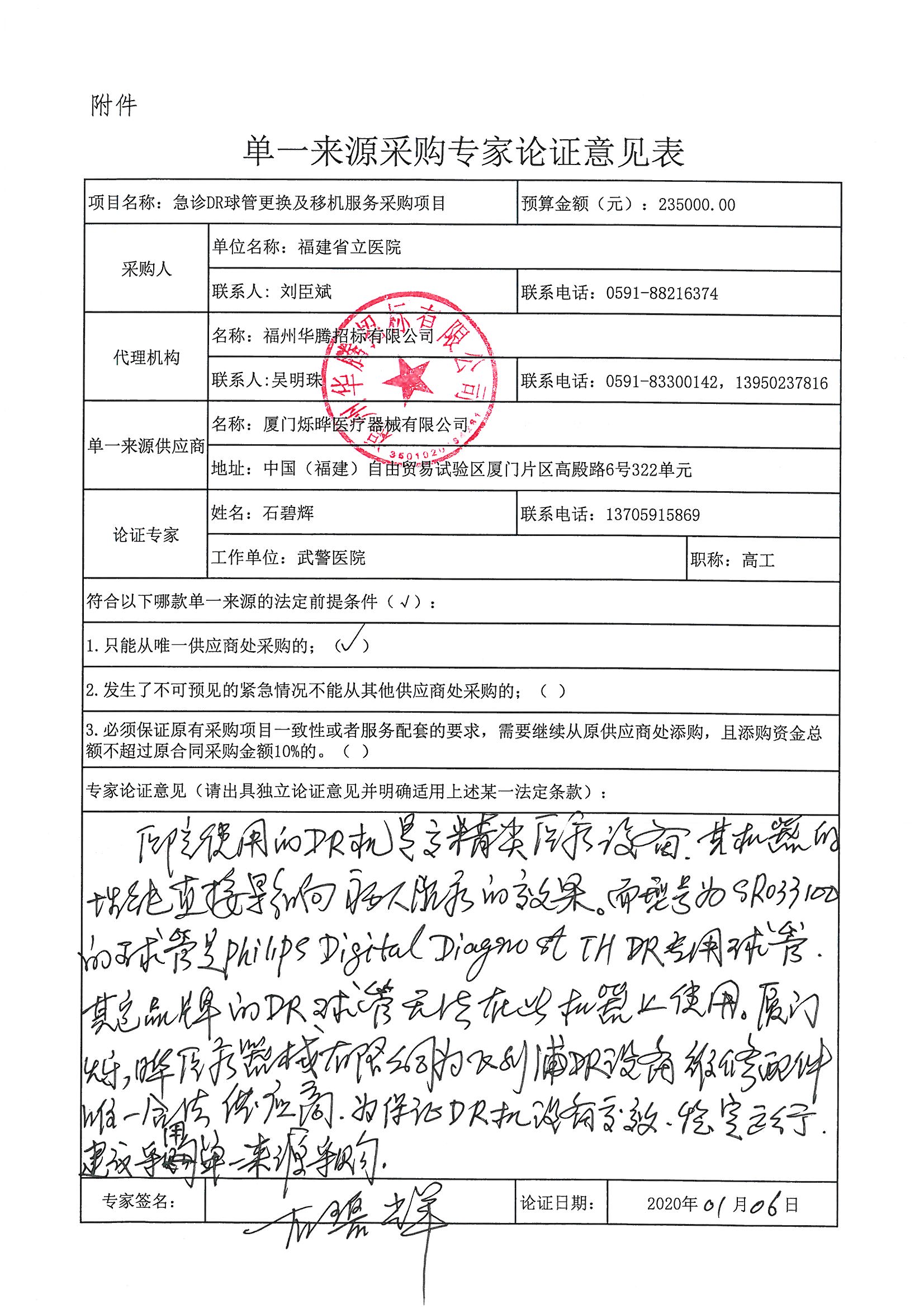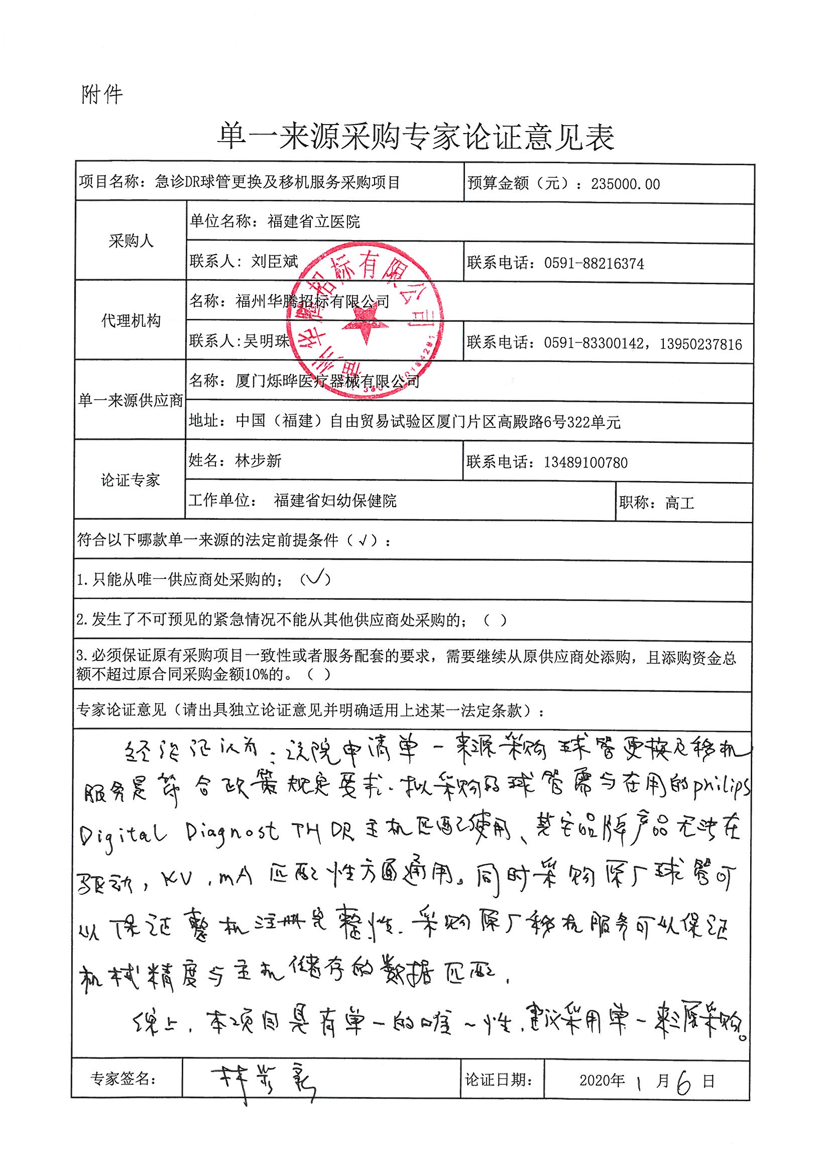 4、采用单一来源采购方式的原因及相关说明:因型号SRO33100的球管为 Philips Digital Diagnost TH DR专用球管,已在医疗器械注册证中明确说明,无任何第三方球管可替换, 且厦门烁晔医疗器械有限公司为飞利浦DR设备维修配件唯一合法供应商,可提供原装球管,并附带球管认证证书。飞利浦公司生产的原厂球管,通过了国家食品药品监督管理局SFDA球管与DR整机的匹配性测试检验,能够保障安全,保障设备的高效、稳定运行,保障最佳的图像质量,故申请单一来源采购。