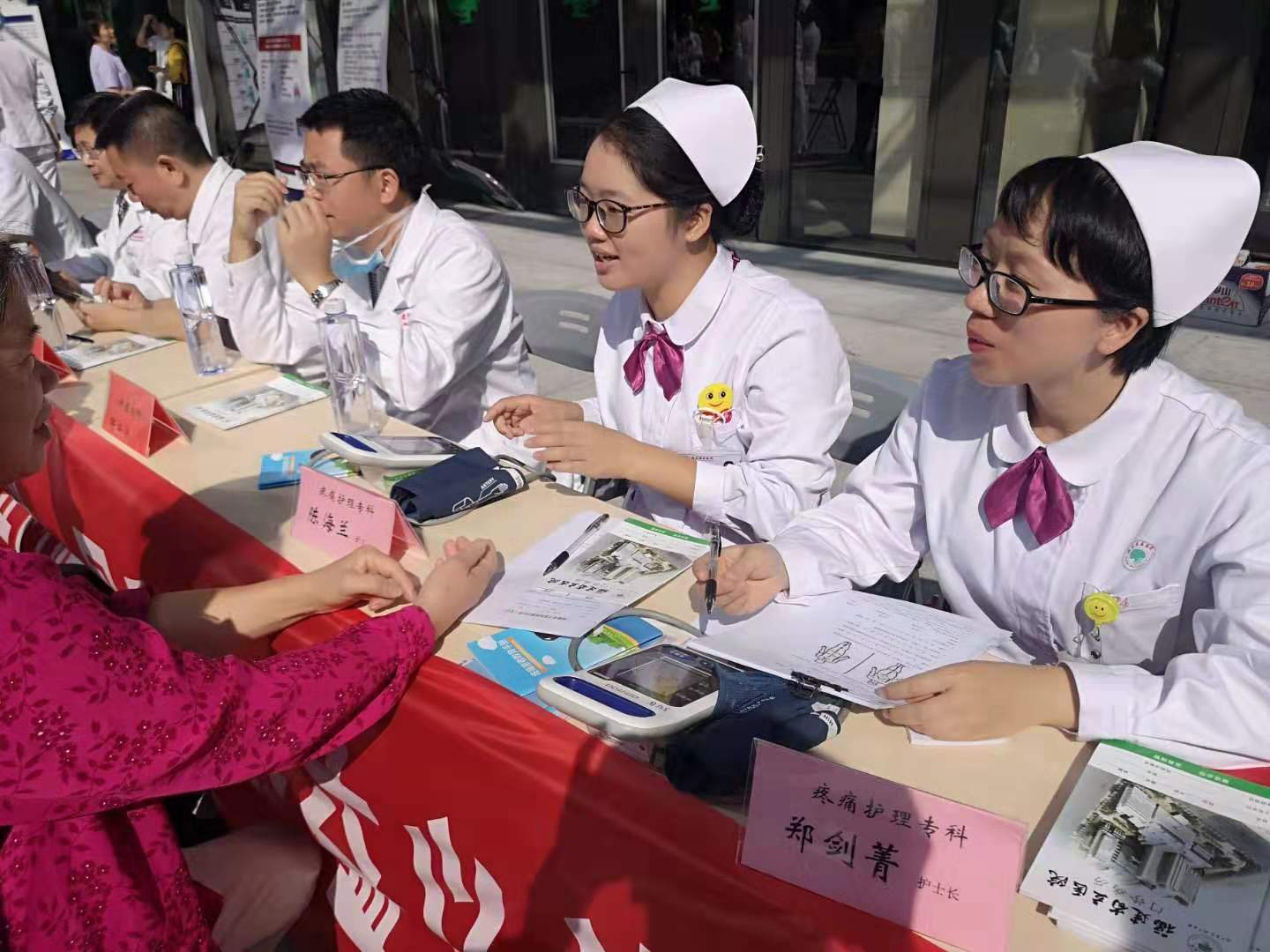 活动还没开始,前来咨询的群众,热情就如当日的太阳般火热。大家自觉的排好队伍等待咨询或就诊。专科护士们及时搬来折叠椅让老年群众可以坐着休息,她们现场为患者提供免费血压测量,指导他们进行疼痛评估,并发放疼痛日记、疼痛知识宣教手册,普及有关疼痛的相关知识。烈日下,众多患者根据疼痛发生的不同原因被有序地引导至不同专科医生处。医护人员根据患者的病情,给出合理化的建议,并为部分疼痛疾病患者免费做冲击波治疗。