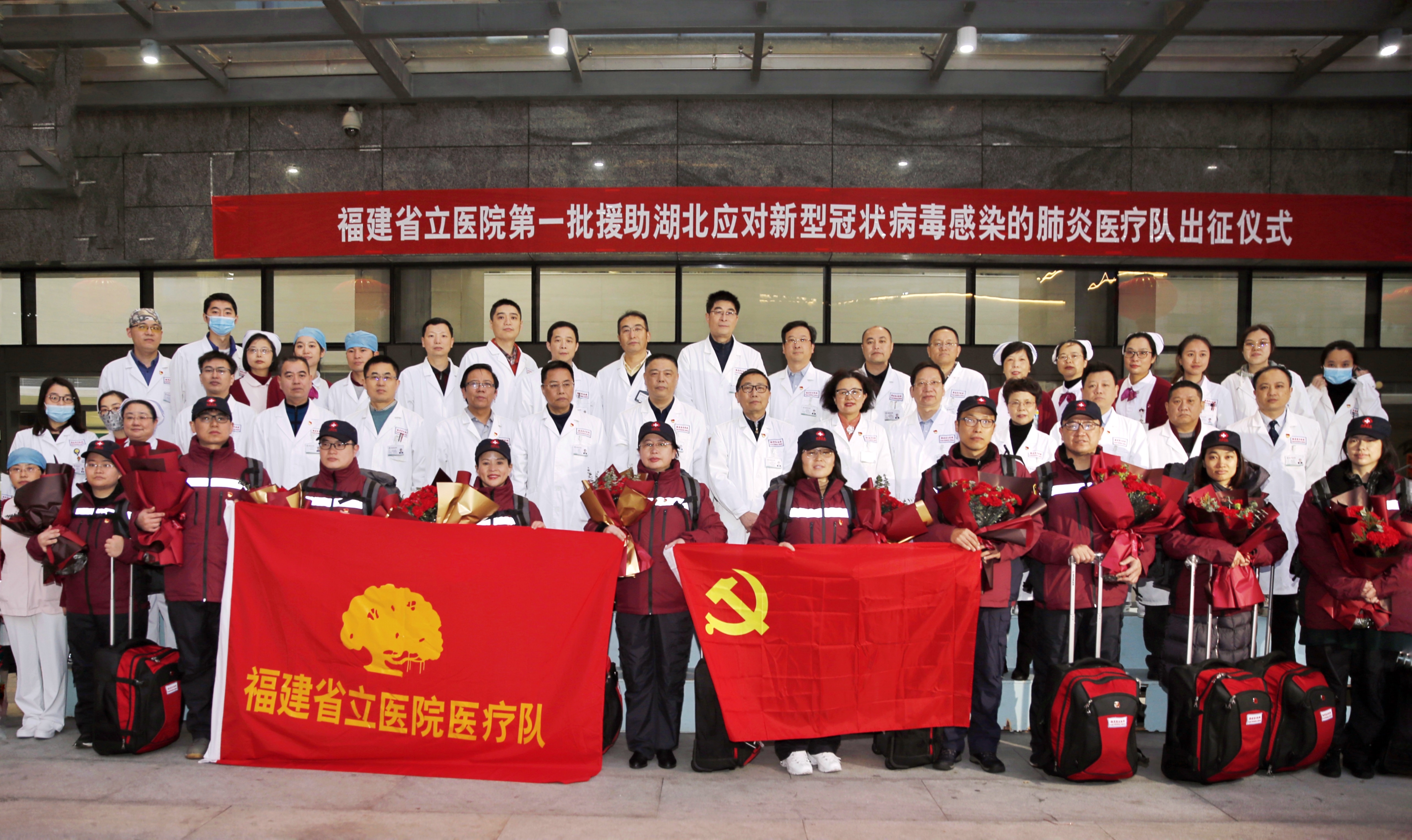 1月27日,农历正月初三。繁星尚未隐去,福建省立医院院区一簇簇不眠的灯光映着拂晓的晨曦,医院喷泉广场上,鲜艳的五星红旗迎风飘扬。福建省立医院第一批支援湖北抗击新冠肺炎疫情医疗队在此集结,准备出征。