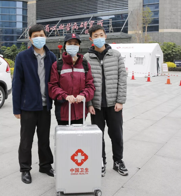 陈美榕的儿子今天也来到现场为妈妈送行,他今年高二,成绩优异,受母亲的影响,也立志从医。当一家三口站在一起时,他已是最高那个,是爸妈的骄傲!临行,他跟妈妈说:保护好自己,武汉一定能赢,中国一定能赢!