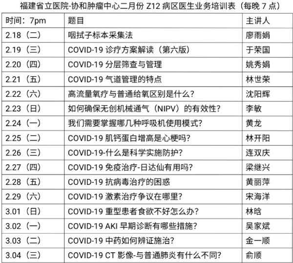 加之此次新型冠状病毒来势汹汹,诊疗经验也都在逐步形成中。如果仅用现有的知识,去应对新的病毒、新的疫情,还是捉襟见肘。为此,在队员的积极提议下,医疗队经过商议后,开出了培训清单,每晚七点组织新冠肺炎相关知识的学习和培训。特殊时期,为了减少交叉感染,医疗队还因地制宜,尝试了网络视频学习课堂,取得成功。