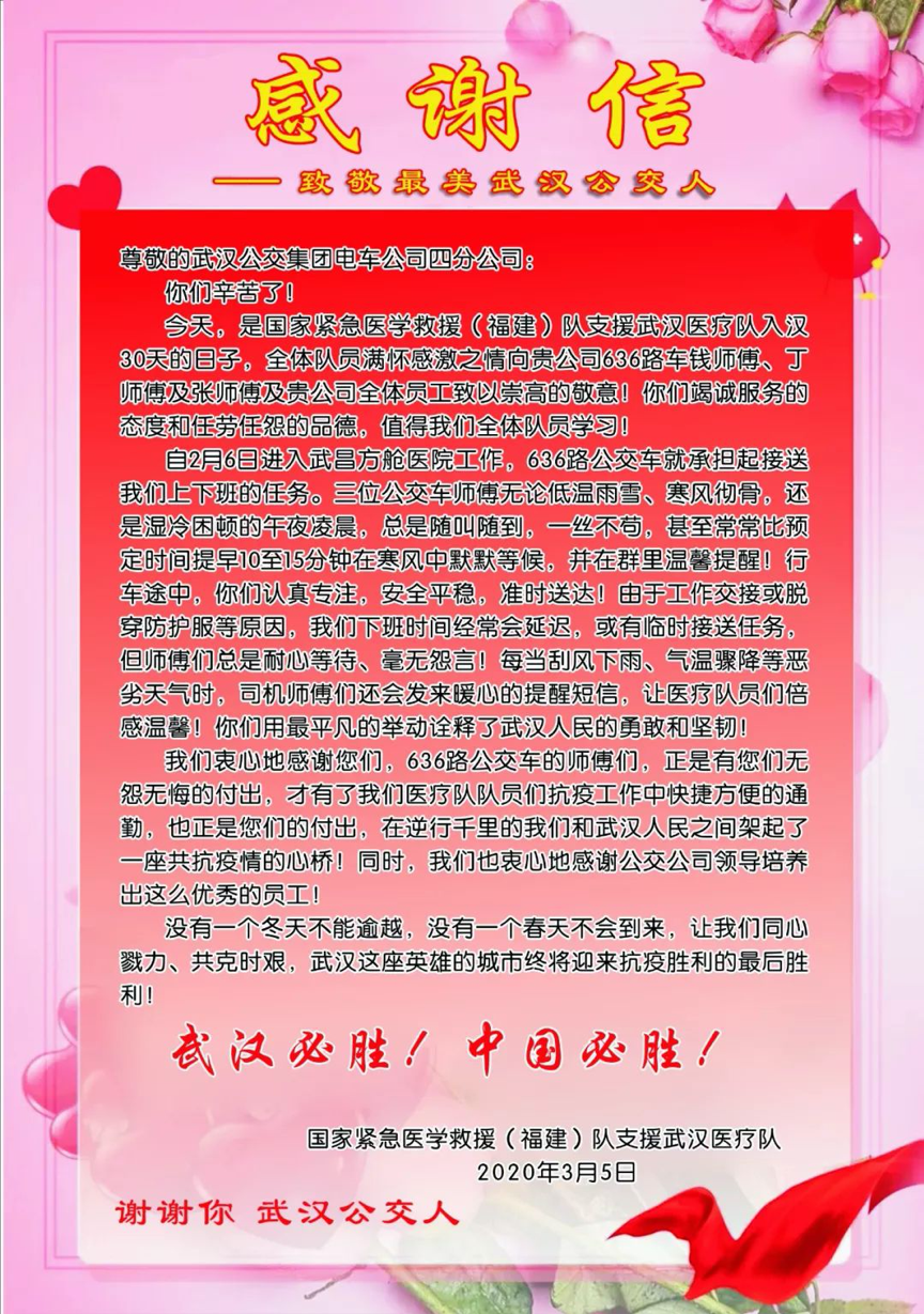 在武汉的医疗队员们说:我们只是换了个上班的地方,对我们而言,与众不同的是,这条往返于驻地和医院的上班之路。因为,无论刮风下雨、白天黑夜,总有武汉的公交车、志愿者司机们在默默守候,暖心的驾车接送,我们是共同抗击疫情的战友,大家风雨同路,是相亲相爱的一家人。