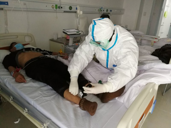 “一位中年患者入院,我去他床前询问病史,他的第一个动作就是戴上刚摘下的口罩,他在对抗病魔的同时也在努力保护着我们。”医疗队员潘小滨说。