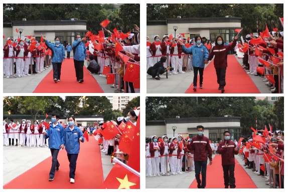 傍晚,福建省立医院、省立金山医院为全体援鄂医疗队员举行致敬礼活动。院领导逐一宣读援鄂医疗队员名单,队员们庄重走进医院大门,踏着红色地毯,接受省立人最温暖和隆重的致敬。此时,喷泉雀跃,凯歌高奏,欢呼声和掌声经久不息。