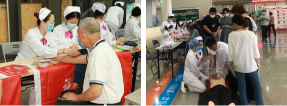 专科护士们为群众现场量血压、测血糖,提供慢病管理健康咨询,指导群众掌握专科疾病及慢性病居家护理技能,尤其是疫情期间自我防护、营养膳食、心理调试等方面。现场陆续为近300多名群众提供健康宣教,100余位群众测量了血压、血糖,50余位患者家属接受心肺复苏和海姆立克急救法培训。