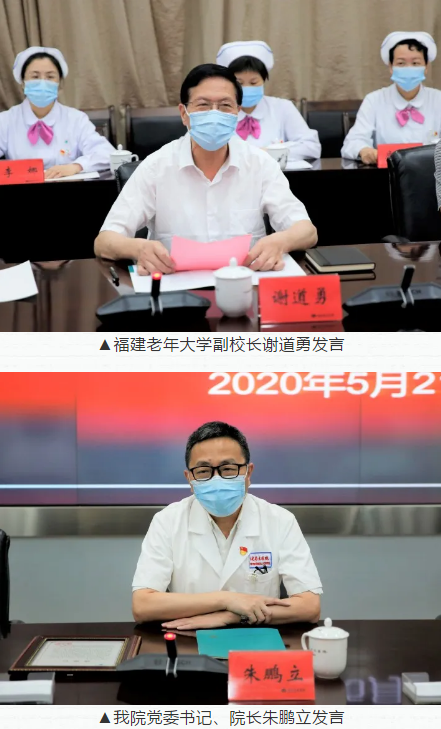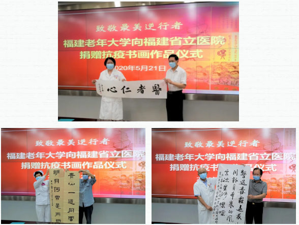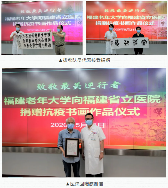 5月21日,“致敬最美逆行者”——福建老年大学抗疫书画作品捐赠仪式在我院举行。福建老年大学副校长谢道勇,金秋画院院长温心坦,副院长蔡尔申、阮天朝及书画家代表一行来院捐赠抗疫书画作品,我院援鄂医疗队队员代表接受捐赠。