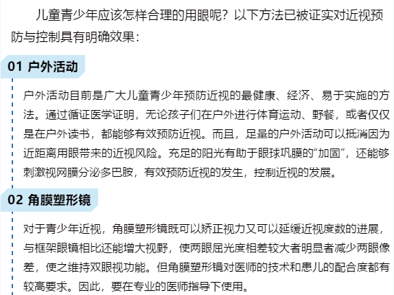 最终,许诺医生让小亮在夜里睡觉时给右眼戴上“角膜塑形镜”控制眼轴增长,并让小亮妈妈规范孩子的用眼姿势,多带孩子到户外活动。