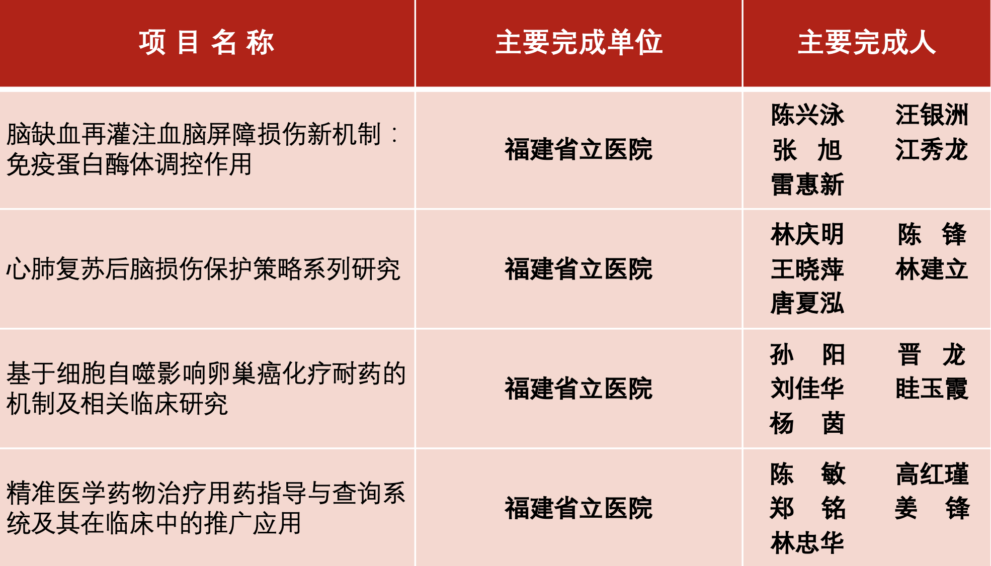近日,福建省医学会公布2019年福建医学科技奖获奖名单,全省共44项获奖,我院共有7个项目荣登榜单,其中一等奖1项,二等奖2项,三等奖4项。我院肝胆外科陈实副主任医师主持完成的项目“胰腺恶性肿痼和代谢疾病的系列研究”荣获一等奖;由内分泌科、耳鼻咽喉科、中医科等专科团队参与完成的项目获两项二等奖;由神经内科、急诊医学科、妇产科、临床药学等专科牵头组成的研究团队获四项三等奖。