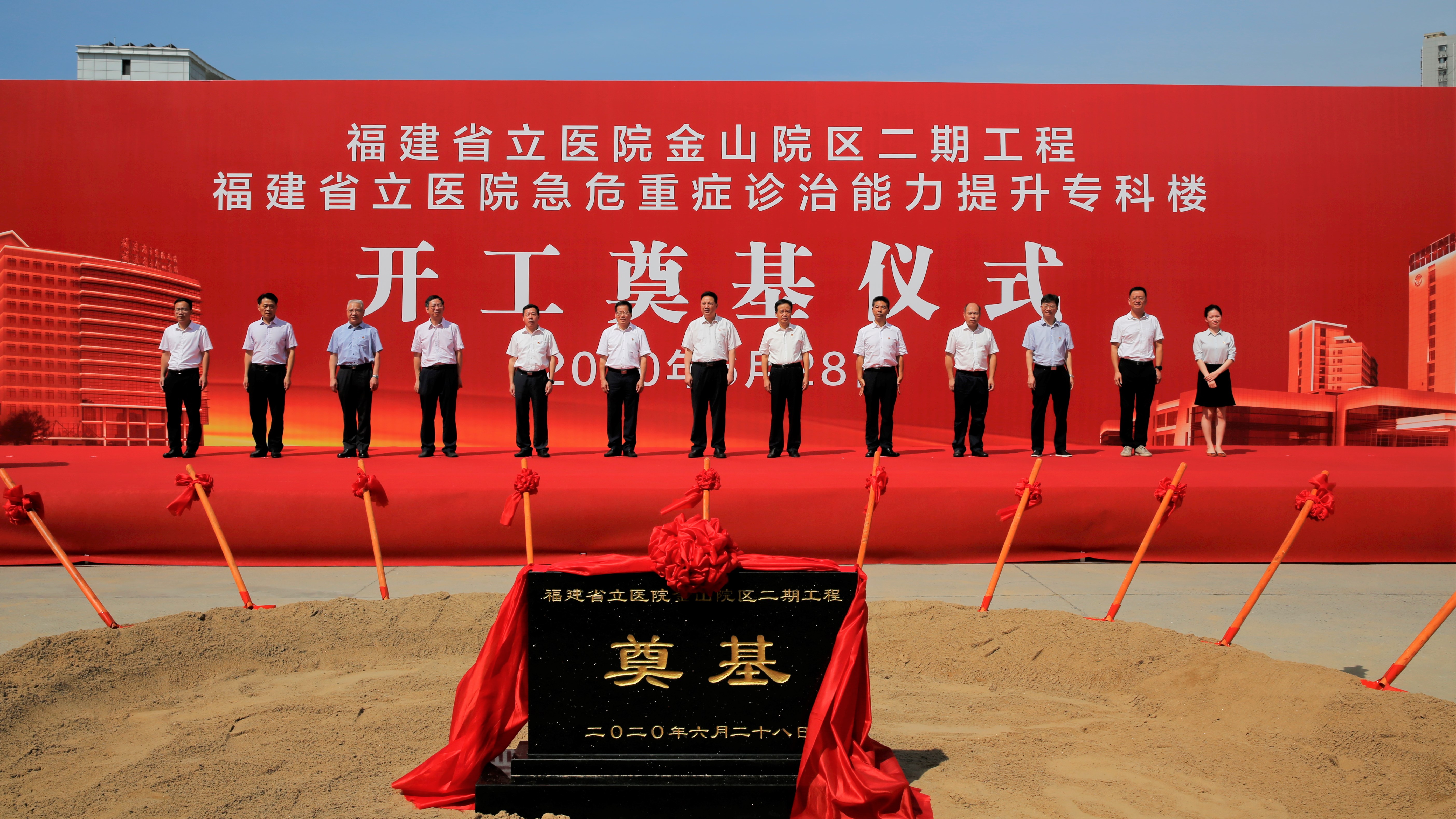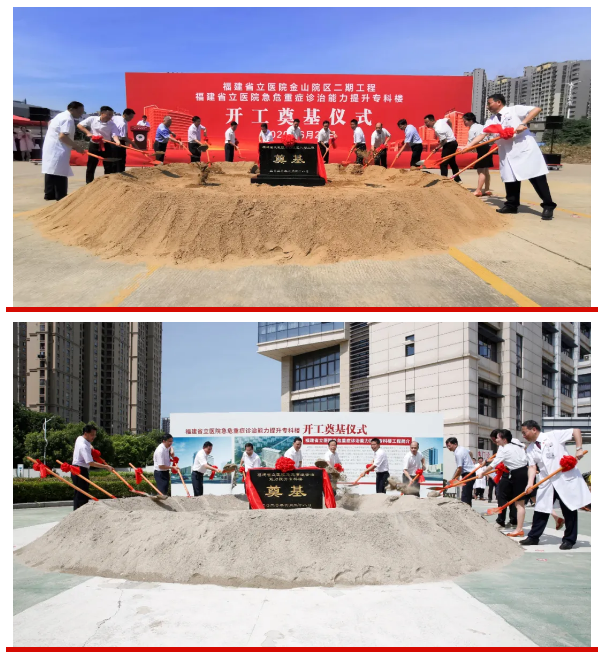 2020年6月28日上午9时,碧空万里、天清气朗,福建省立医院金山院区二期工程、福建省立医院急危重症诊治能力提升专科楼两项福建省2020年重点建设项目工程同时开工,奠基仪式在福建省立金山医院举行。