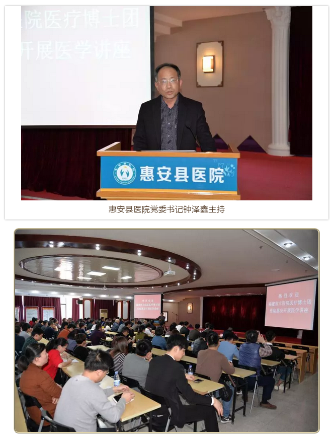 博士团应邀在惠安县医院举行医学讲座活动,魏世超教授、惠安县医院院长曾荣东出席活动并致辞,惠安县医院党委书记钟泽鑫主持,惠安县多家基层医院近200名同仁参加活动。