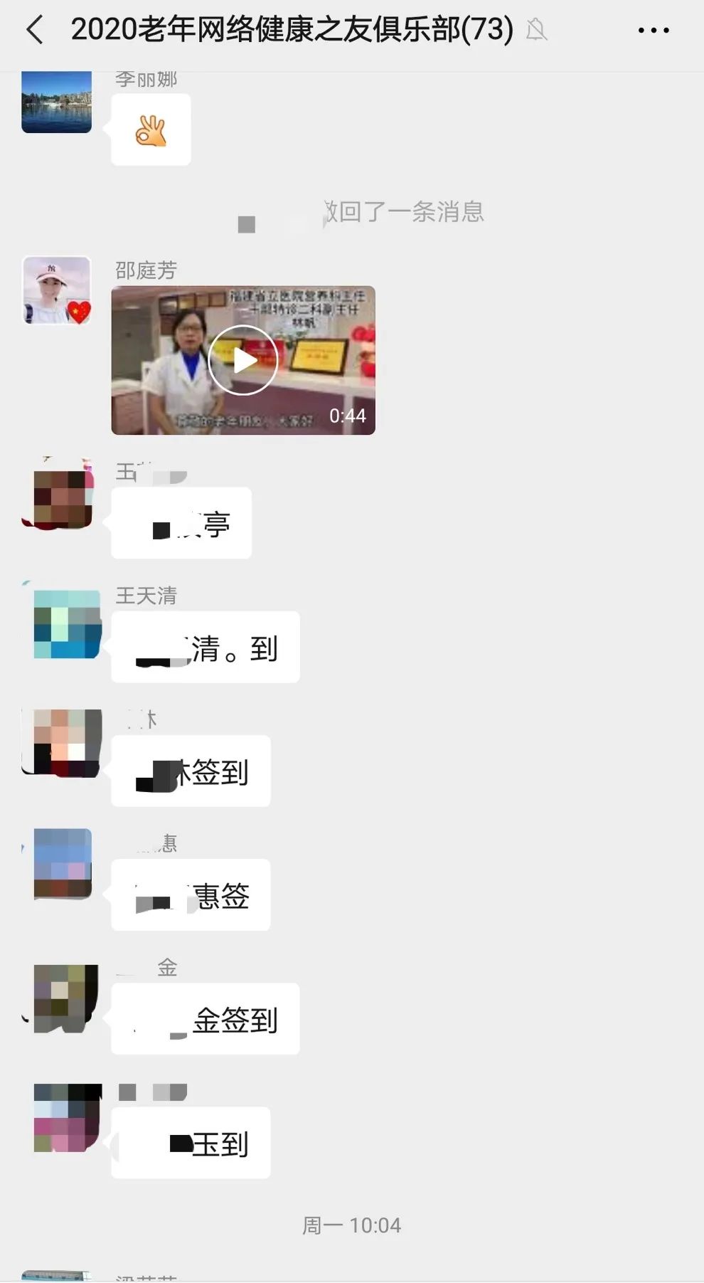 老年健康之友俱乐部是以俱乐部的形式,定期组织多学科专家现场为老年患者普及健康科普知识,寓教于乐。俱乐部开办15年来,受益者超8万余人,已打造成我院科普公益的精品项目。每一期俱乐部开班前,老年朋友都早早报名。今年由于常态化疫情防控形势,俱乐部改为网络办班模式,通过微信群完成视频学习和知识问答等,实现“学员不到院,网课不停教”。本期俱乐部由护理部发起,老年护理专科主办,糖尿病护理专科、中医护理专科、呼吸护理专科联办,让医护人员意想不到的是,60个学员名额也是短短几天内就报满了。