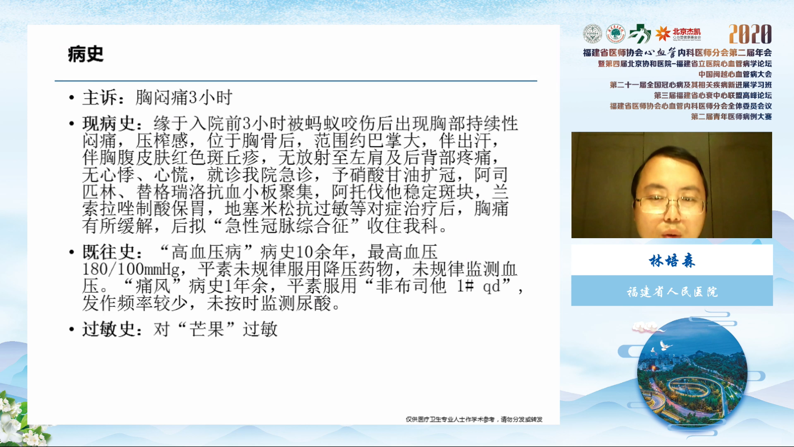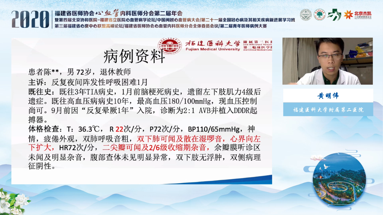 福建省医师协会心血管内科医师分会青年医师病例大赛同期举行。本着“以题会友”的精神,参赛的10个病例,涉及白塞氏心血管病、irAE、致心律失常右室心肌病、鼻咽癌伴远处转移造成的颈动脉窦性晕厥等主题, 青年医师的分享尤为精彩。