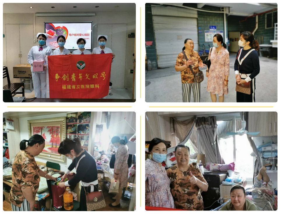 眼科医护人员由党、团支部书记饶惠英、刘灵颖带队,慰问省红十字会资助的困难老人,为困难户送上爱心基金4500元及生活慰问品。