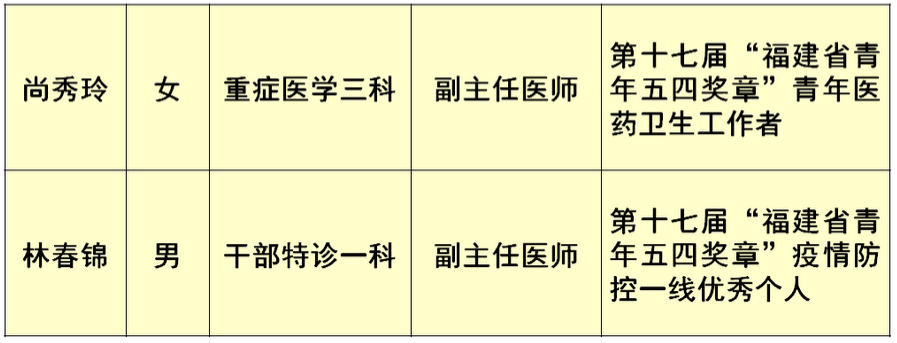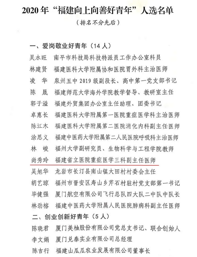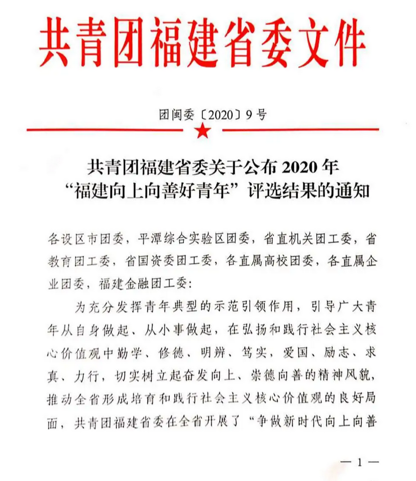 近日,共青团福建省委、福建省青年联合会评选出第十七届“福建青年五四奖章”个人共100名,其中我院2位青年荣获殊荣。同时,共青团福建省委发布《共青团福建省委关于表彰2019年度“福建省优秀共青团员”“福建省共青团干部”“福建省五四红旗团(总)支部”的决定》,福建省立医院、省立金山医院2名优秀个人、1个集体受表彰。1名优秀青年入选2020年“福建省向上向善好青年”。