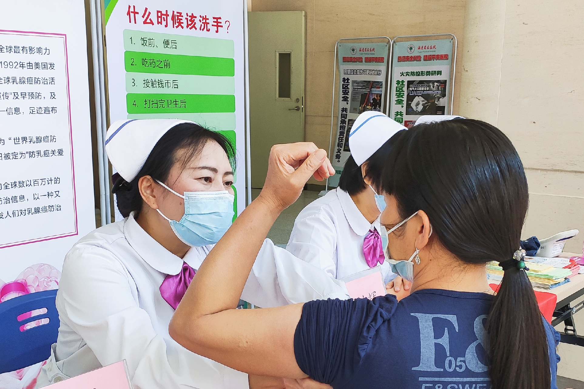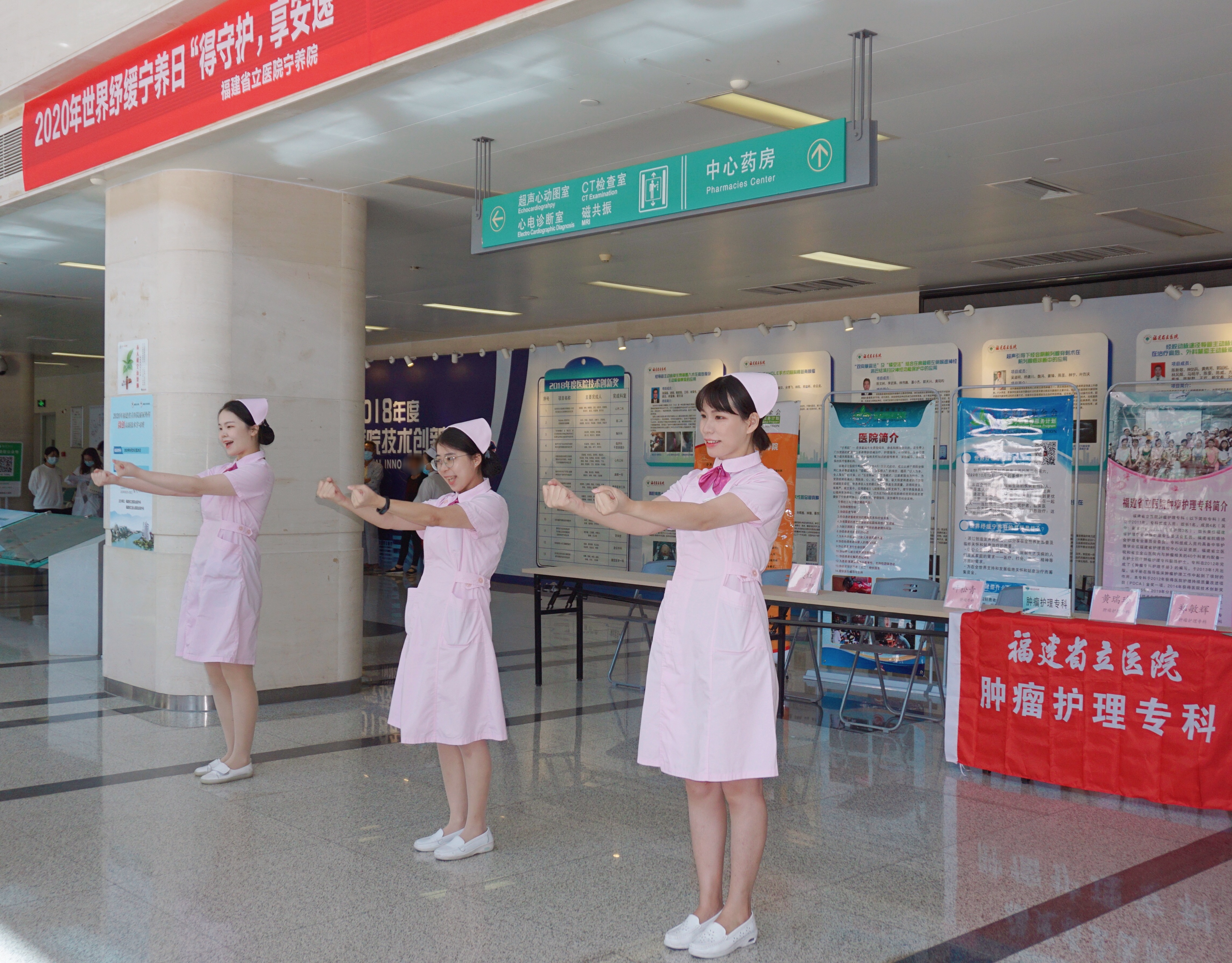 此次活动还邀请了福建新闻广播及舞蹈专业的老师们进行诗歌朗诵及舞蹈表演,一字一句、一颦一笑都蕴含着坚定与真情,让大家感受到希望和鼓励。肿瘤科护士们的《乳腺功能康复操》快闪互动,示范、指导如何进行有趣康复锻炼,吸引了许多过路的患者和家属驻足观看,一起学习,现场气氛活跃。