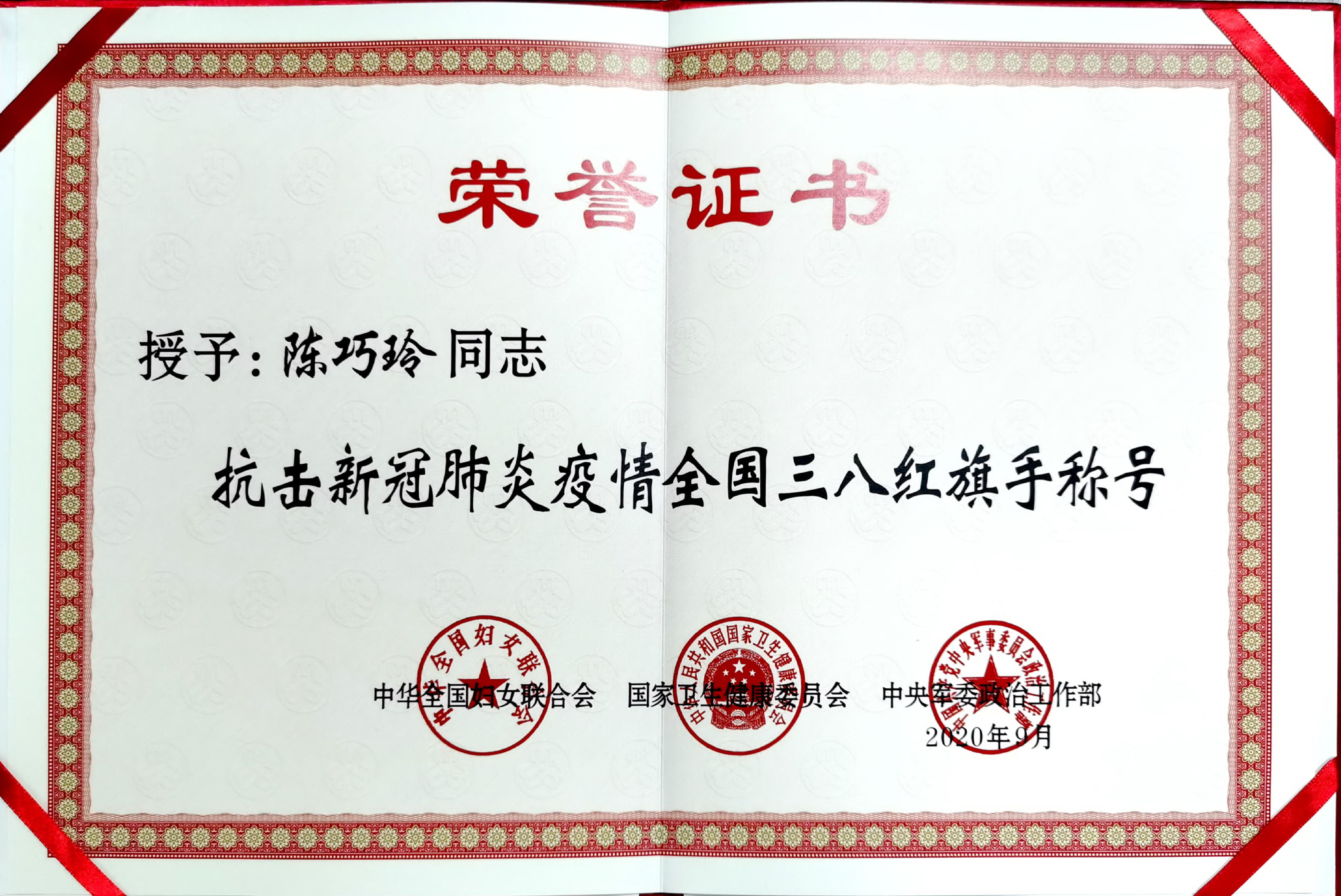 9月29日,抗击新冠肺炎疫情全国三八红旗手(集体)表彰云发布活动在京举行。活动以“弘扬伟大抗疫精神 唱响新时代颂歌”为主题,发布了800名抗击新冠肺炎疫情全国三八红旗手和200个抗击新冠肺炎疫情全国三八红旗集体。我院重症医学三科护士长陈巧玲副主任护师获评“全国三八红旗手”。