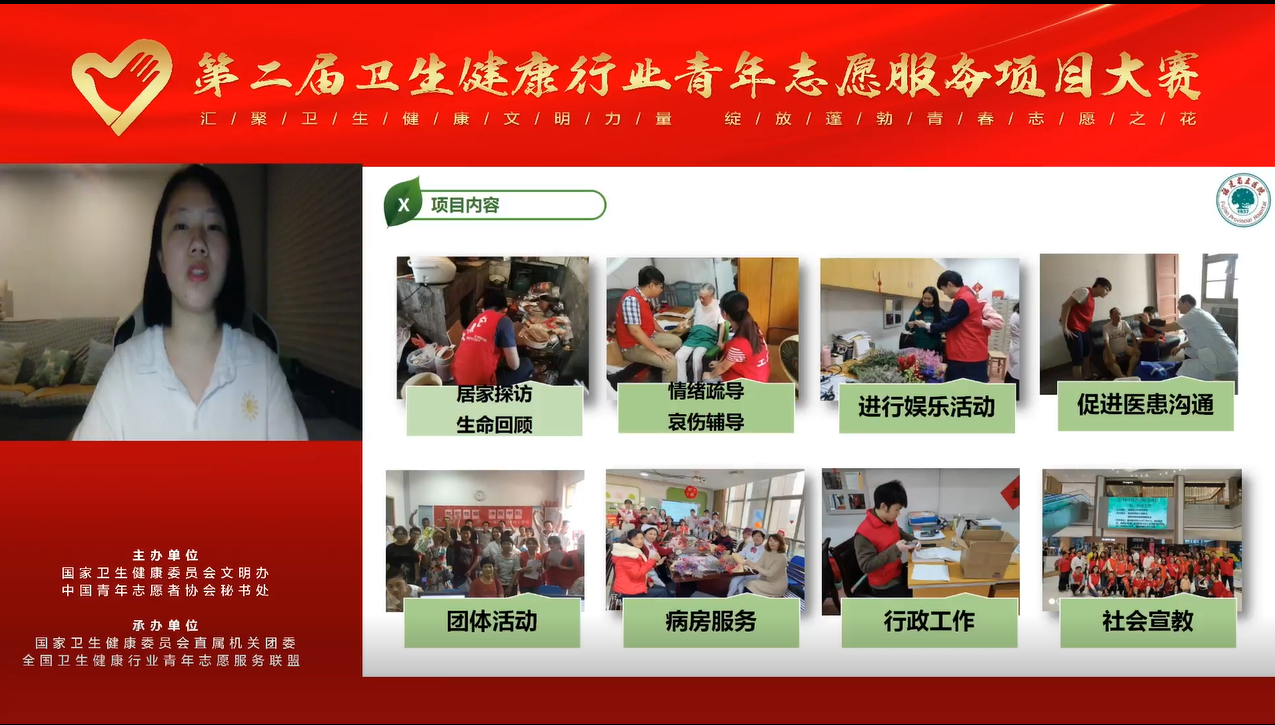 日前,第二届全国卫生健康行业青年志愿服务全国赛决赛暨展示交流活动在北京举行。大赛由国家卫生健康委文明办、中国青年志愿者协会秘书处联合举办。来自全国32个省(区、市)及国家卫生健康委有关直属和联系单位的145个青年志愿服务优秀品牌项目,以“汇聚卫生健康文明力量,绽放蓬勃青春志愿之花”为主题,通过路演视频形式参赛并进行展示交流。我院宁养志愿服务项目《传播安宁疗护志愿精神·陪伴患者走完生命幽谷》获得铜奖。