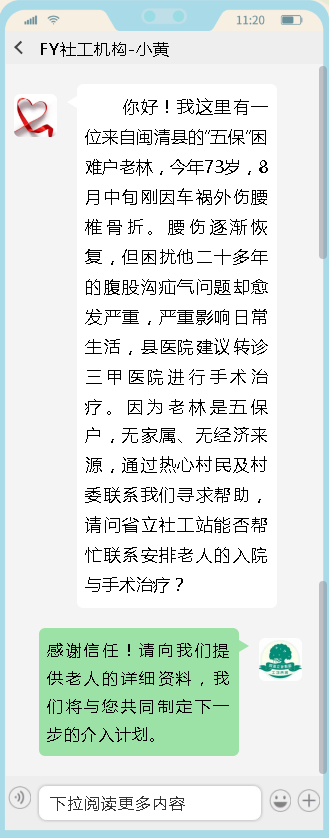 近日,福建省立医院医务社工站接到了来自“五保户”老林的求助。在当地社工机构的带领下,案主一行人从闽清驱车来到省立医院,我们通过前期会谈评估、多部门联合讨论,为他制定了详细的短期个案服务计划。