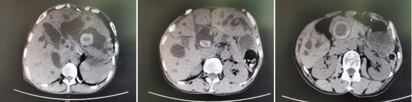 适逢福建省立医院对口帮扶霞浦县医院医联体建立,王奶奶一家人闻悉后,带着期盼而又忐忑不安的心情来到霞浦县医院就诊。CT检查显示:大大小小的石头已经挤满了肝内胆管,在胆总管里也填塞着几颗鹅蛋大小的结石,因为长期的胆汁淤积,肝脏已呈现严重的肝硬化表现,加之经历过多次胆道手术,县医院的医生立即意识到病情的严重性和手术治疗的复杂性。