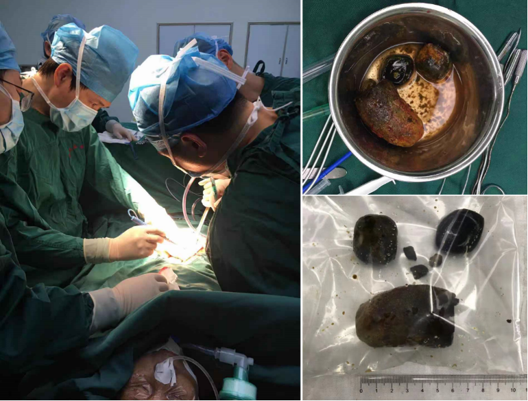 手术团队将患者体内鹅蛋大的结石到米粒、泥沙大小的胆泥逐一清除