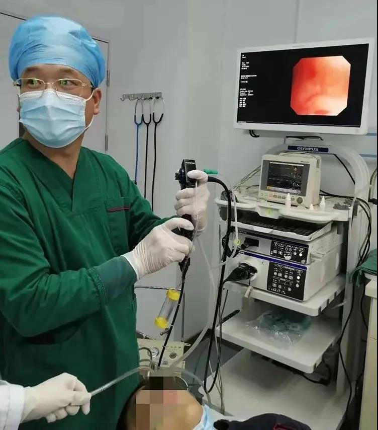 ▲谢宝松教授为第一例麻醉下的病人行无痛支气管镜检查