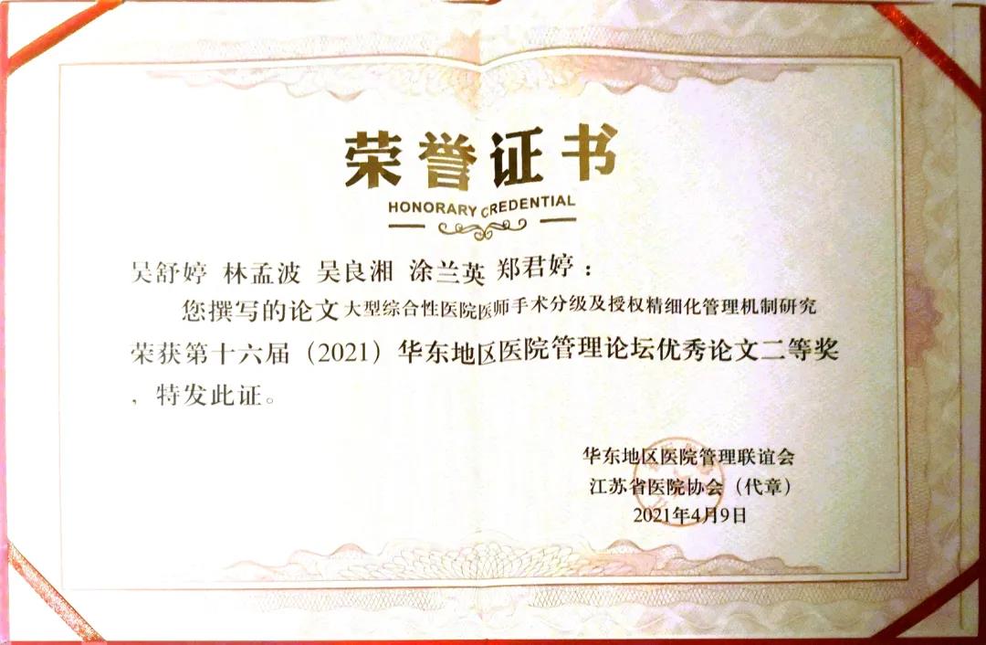● 《大型综合性医院医师手术分级及授权精细化管理机制研究》获得优秀论文二等奖