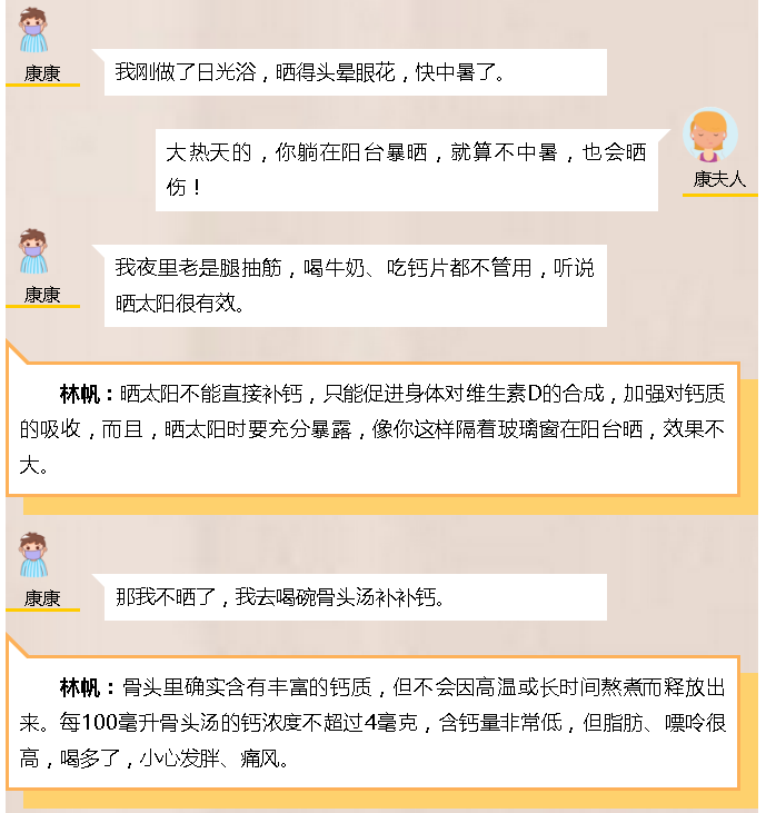 人到中年,康康的腿常抽筋,听说“晒太阳能补钙”,入夏后,他常晒太阳,但是,晒黑了一大圈,还险些中暑,夜里仍旧腿抽筋。