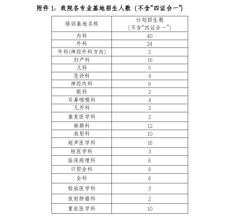内科、外科、外科(神经外科方向)、妇产科、儿科、急诊科、神经内科、眼科、耳鼻咽喉科、儿外科、康复医学科、麻醉科、放射科、超声医学科、核医学科、病理科、口腔科、全科医学科、医学检验科、放射肿瘤科、重症医学科。