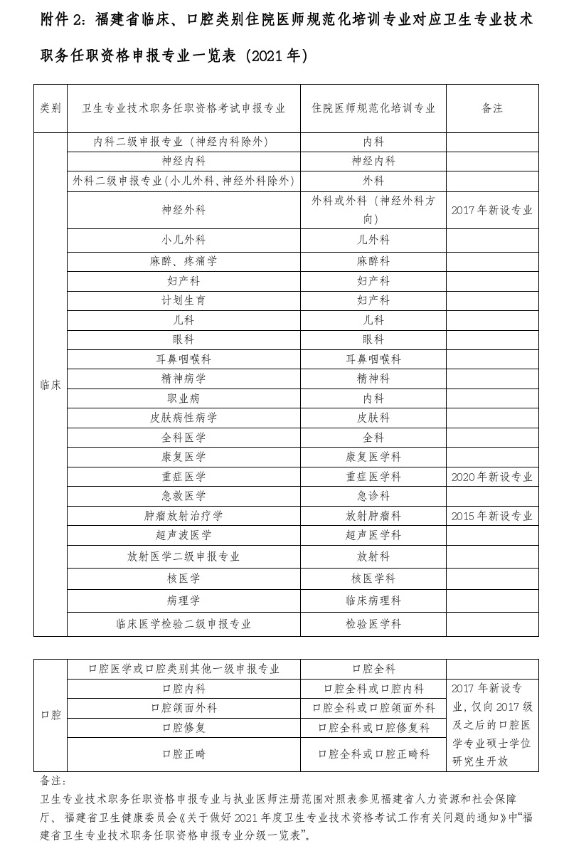 3.请参考附件2《福建省临床、口腔类别住院医师规范化培训专业对应卫生专业技术职务任职资格申报专业一览表(2021年)》,确认拟申请的培训专业。