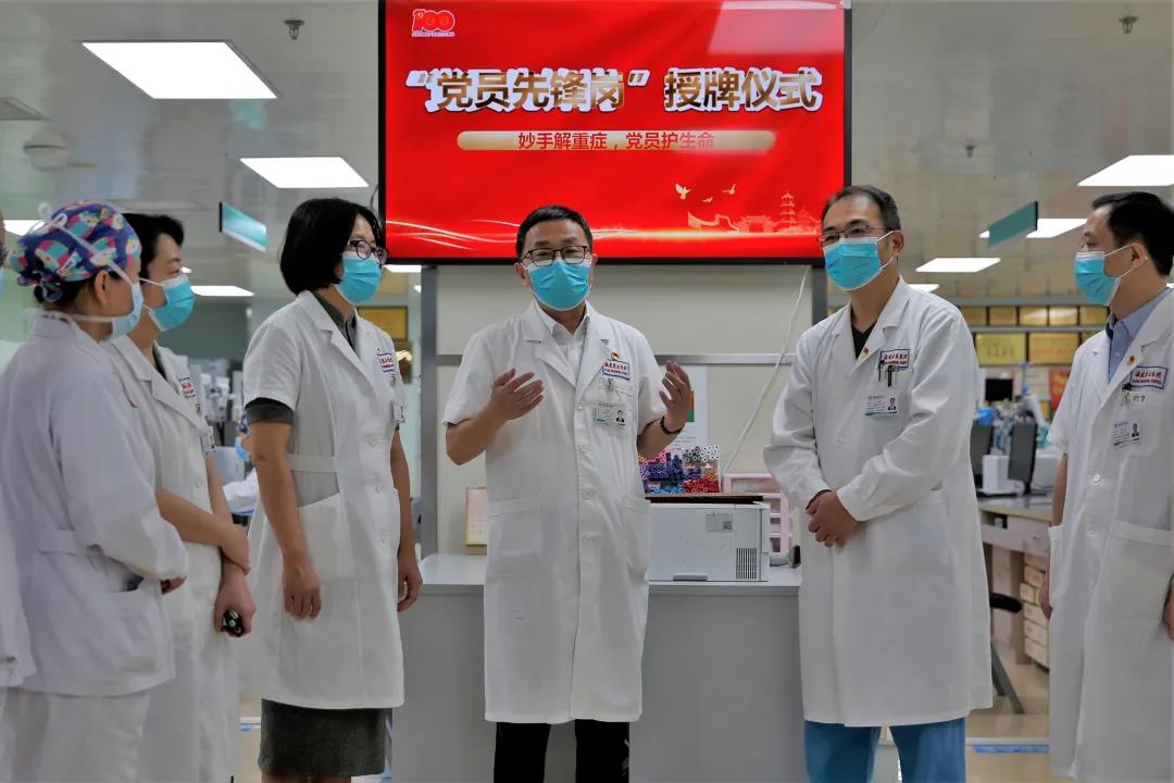 6月24日,院党委正式为“党员先锋岗”授牌。党委书记、院长朱鹏立,党委副书记李红为“党员先锋岗”代表——重症医学三科党支部授牌。
