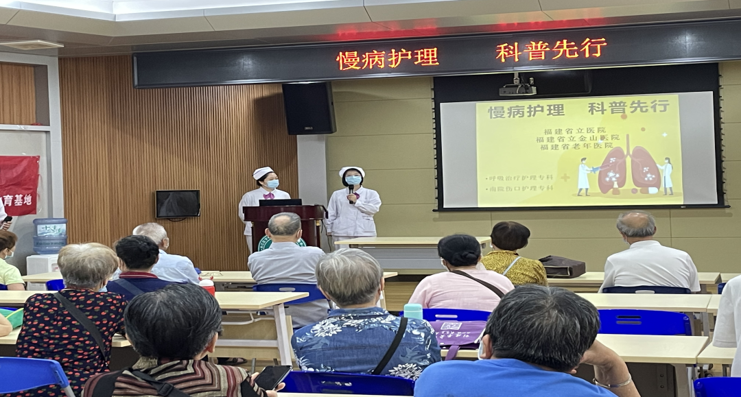 我院呼吸治疗护理专科、省立金山医院伤口造口护理专科联合福建省老年医院专科团队走进台江区宁化街道社区卫生服务中心开展关爱社区老人健康科普讲座,围绕哮喘、肺部功能锻炼、感冒预防、居家皮肤管理等,向社区老人普及慢病健康知识,传播健康生活方式。