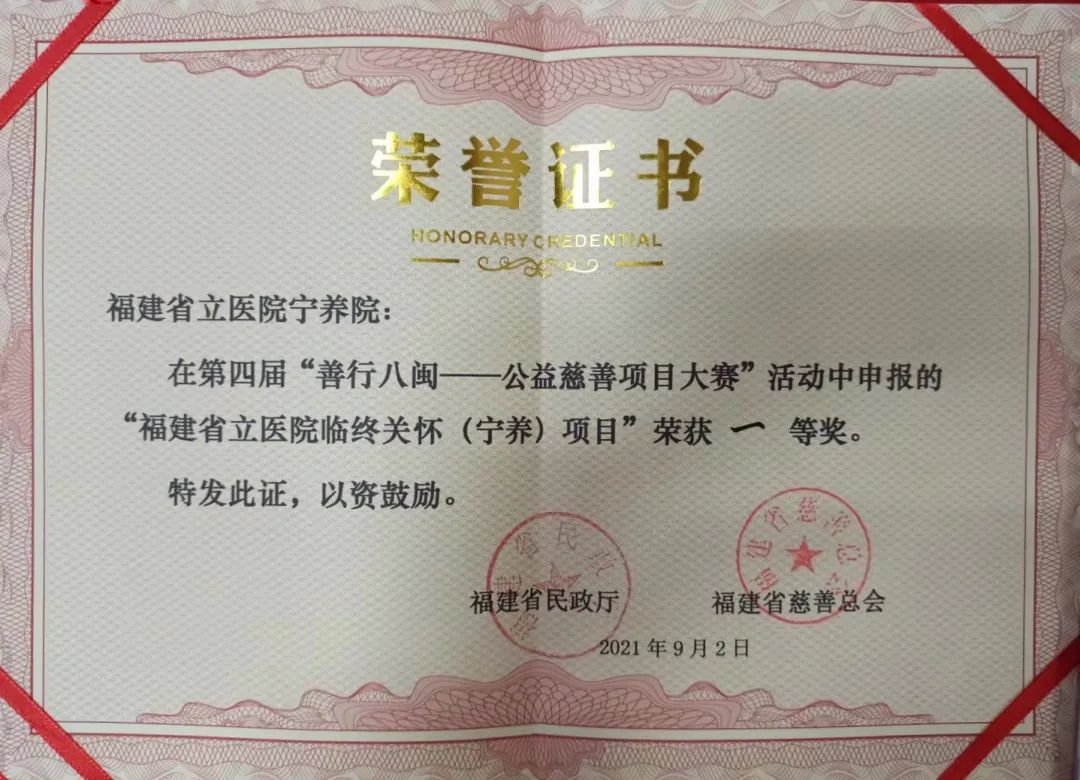 近日,由福建省民政厅、福建省慈善总会主办,福建省海峡社会组织研究院承办,福建省进福公益慈善基金会协办的以“凝聚慈善力量·共建和谐社会”为主题的第四届“善行八闽——公益慈善项目大赛”在福建会堂举行决赛路演及颁奖仪式,我院临终关怀(宁养)项目从350多个项目中过关斩将进入决赛,并荣获一等奖。