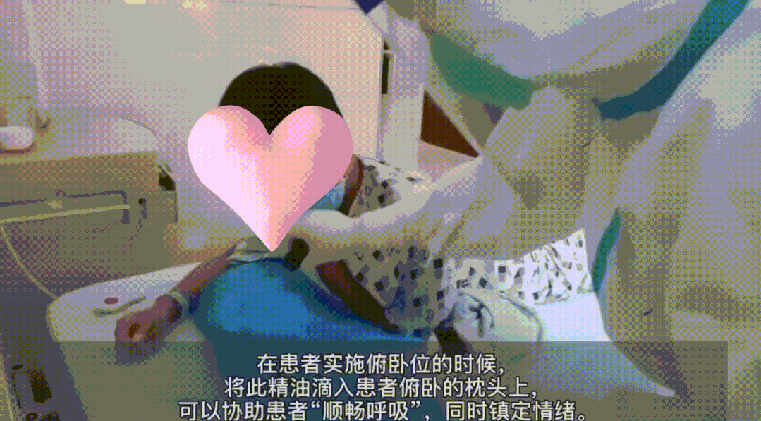 在做俯卧位治疗的时候,考虑到部分患者存在鼻塞、不习惯俯卧位的情况,护士们便将含有“月桂叶、尤加利、薄荷、柠檬”等成分的精油涂抹在鼻翼两边的迎香穴上,有助于患者通鼻,提高体位护理效果。
