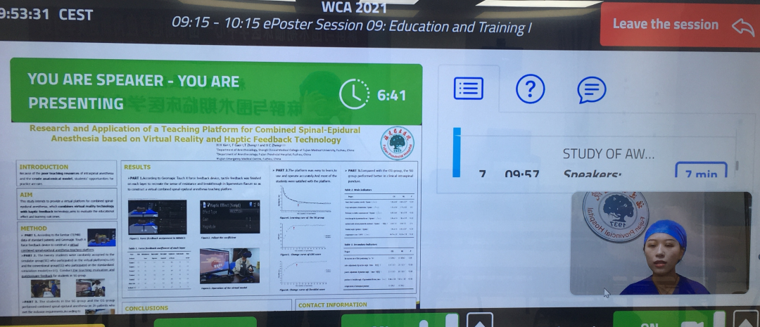 其中研究生解慧泓(导师郑晓春教授)的论文——基于虚拟现实与触觉反馈技术的腰硬联合阻滞教学平台的研发与应用(Research and Application of a Teaching Platform for Combined Spinal-Epidural Anesthesia based on Virtual Reality and Haptic Feedback Technology),被评选为“one of the best 200 abstracts(最佳200份摘要之一)”,并进行线上汇报展示及讨论,得到了国际同行们的认可和肯定。